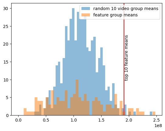 When compared visually to the distribution of means of randomly selected 10-video groups the distribution of view means of feature groups appears distinct.