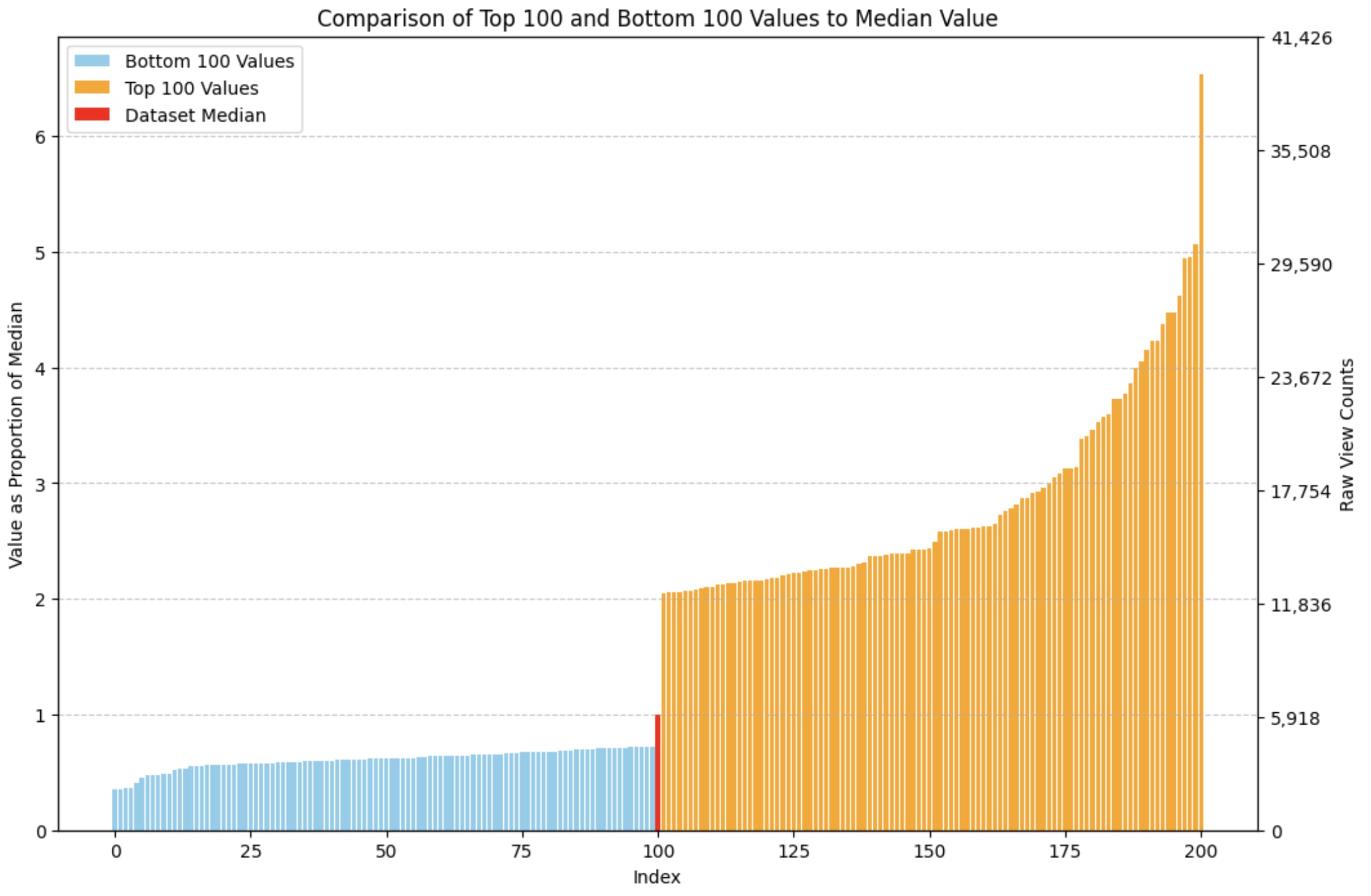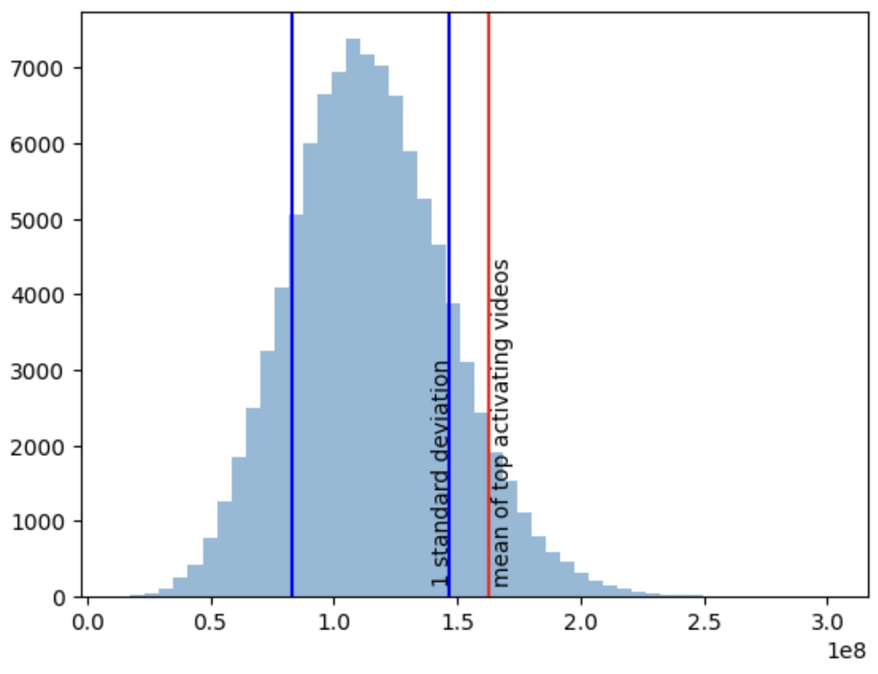 Visually these distributions look very different and when we perform an Kolmogorov-Smirnov test we receive a KS test statistic of 0.9875 and a P-value of 0. This strongly suggests that the Sparse Autoencoder features are grouping the data in a way that is related to video views.