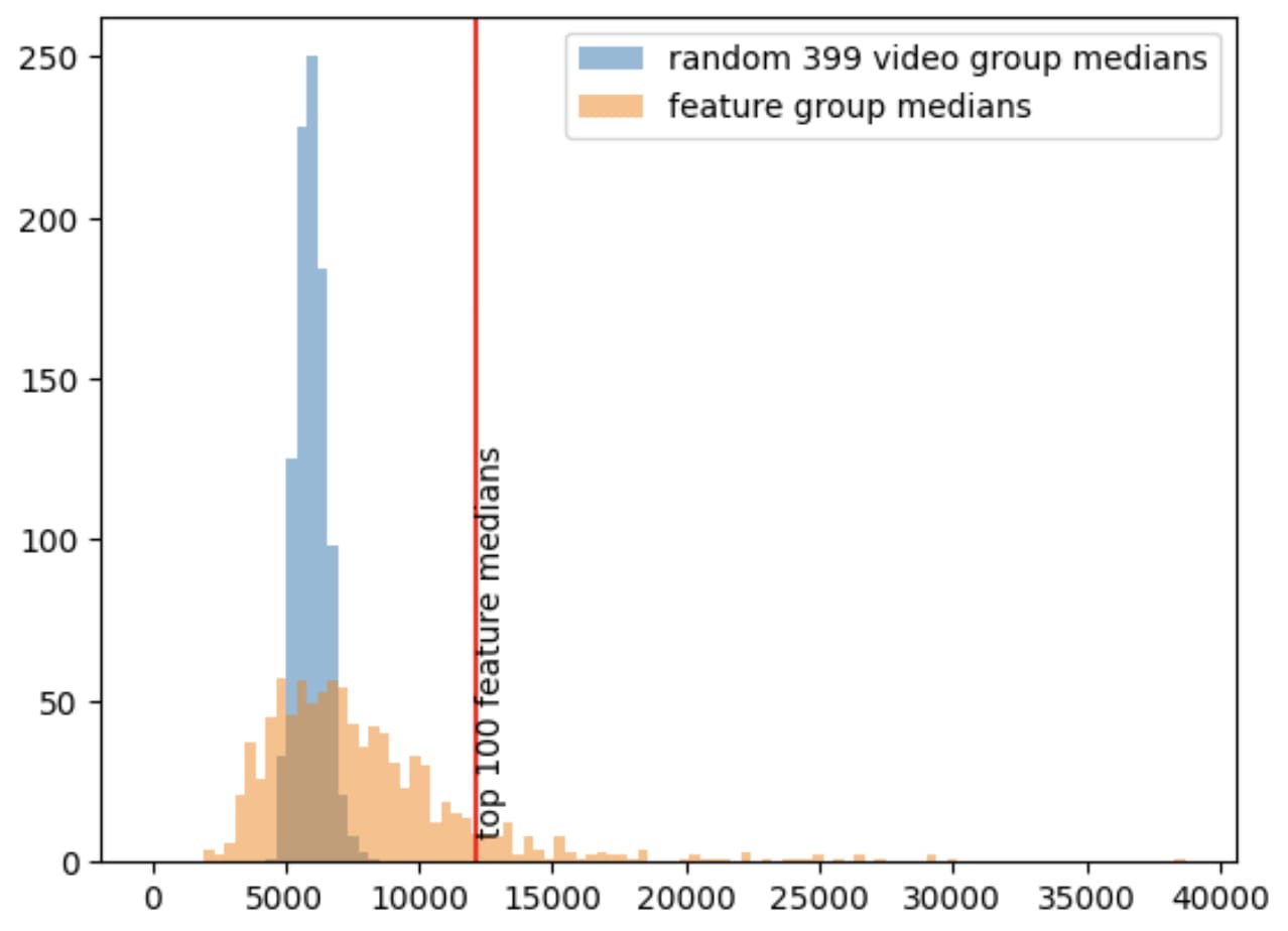 We sample 399 videos entirely at random (with replacement), and repeat this 952 times to create 952 random feature groups. We plot the median view counts of the random feature groups against the median view counts of the real feature groups.