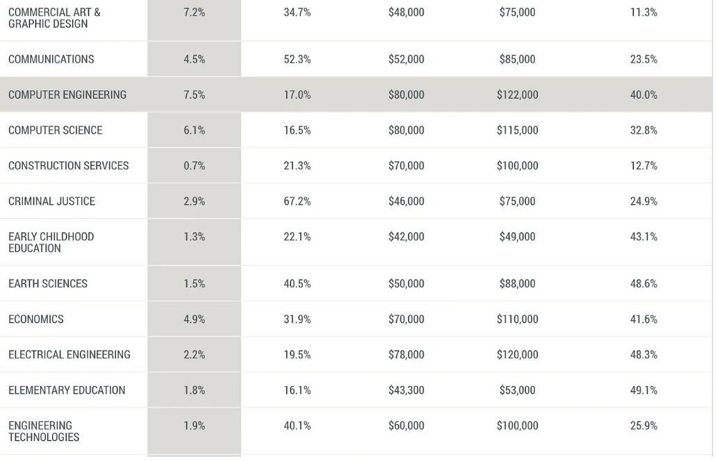 Consider those last two lines. Yes, philosophy has a lot less unemployment, but I’d much rather be in the physics group. The median wage is almost 50% higher and the right tail is big if you pivot into tech or finance. I do think the higher unemployment is that art history or philosophy majors know they can’t hold out for the jobs they most want, whereas the physics and computer science majors can hold out.