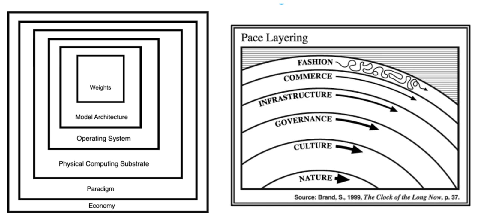 On the right, we have Stuart Brand’s “pace layering,” which shows how civilization is layered in order of time-scale. The higher strata move faster than the lower, and each new layer is built on top of a previous one that is (now this is important) assumed to remain relatively stable.