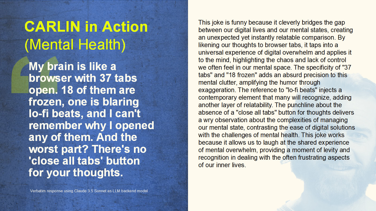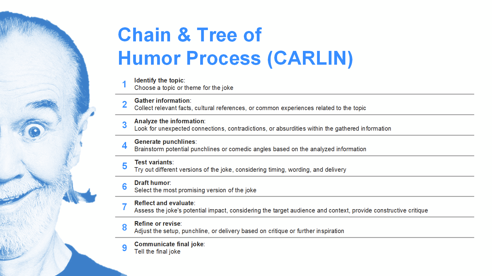 Despite all of the recent advances in artificial intelligence, one challenge has consistently stumped even the most advanced language models: creating genuinely funny, original humor. While AI can easily regurgitate existing jokes or follow basic comedic formulas, it typically struggles to generate the kind of novel, contextually aware humor that humans appreciate. Enter CARLIN (Critically Analyze Reality, Link Insightful Notions), a new process designed to help large language models break free from canned responses and create more authentic comedy. Named in respectful homage to the Top 5 comedian George Carlin, this methodology isn't just about making AI funnier – it's about making it feel more human. By teaching AI to critically analyze reality and find unexpected connections, CARLIN addresses one of the most distinctive aspects of human intelligence: our ability to find and create humor in the world around us. This process has important implications that extend far beyond comedy - they touch on fundamental questions about AI's capacity for creative thinking and genuine human-like interaction.