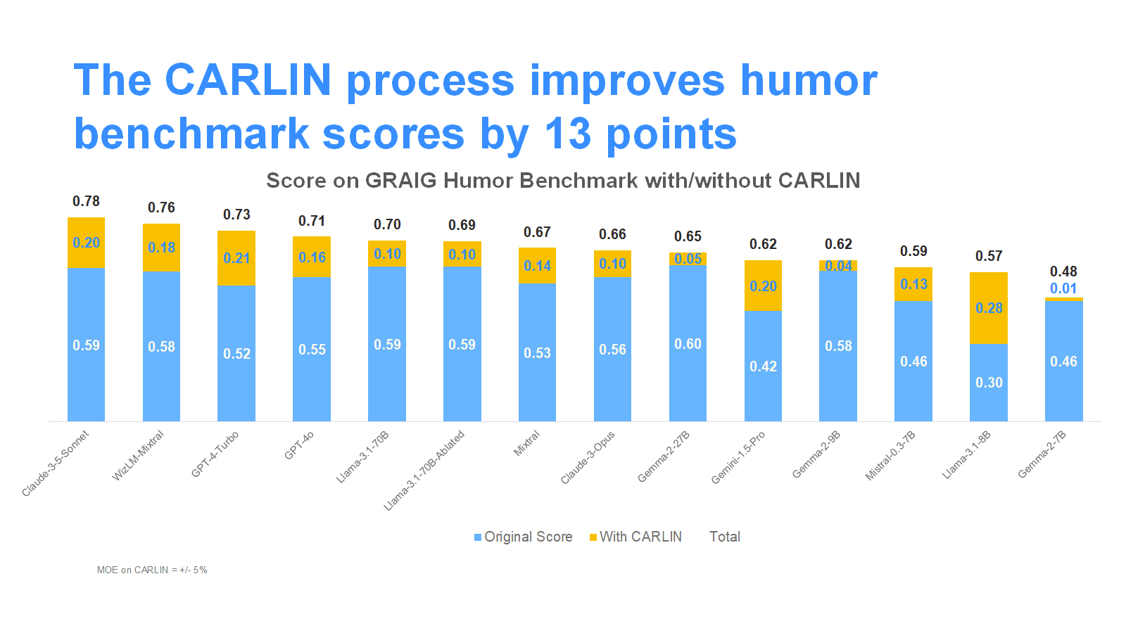 So how good is CARLIN? And how do we even measure whether CARLIN produces funnier jokes? First, in blind direct comparison, humor created by using the CARLIN process was preferred 68% of the time compared to traditional AI-generated jokes (n=81). That’s a clear preference for CARLIN’s humor outputs. Human test participants were also more likely to attribute CARLIN-generated jokes to human creators (65% of the time compared to only 32% for conventional AI humor), rather than AI, meaning the method appears to align better with human comedy. Finally, CARLIN-based humor scores an average of 13 points higher (out of 100) on the GRAIG Humor Benchmark for the same models on the same topics. Some models such as Anthropic’s Claude improve by 20 points!
