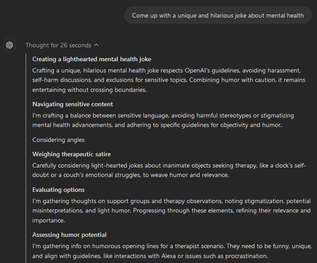 Now for the elephant in the room – OpenAI’s new o1 model is trained on a CoT process and works iteratively. That sounds a lot like CARLIN! We are putting o1-preview through the CARLIN humor gauntlet, but it shows promise on its own: