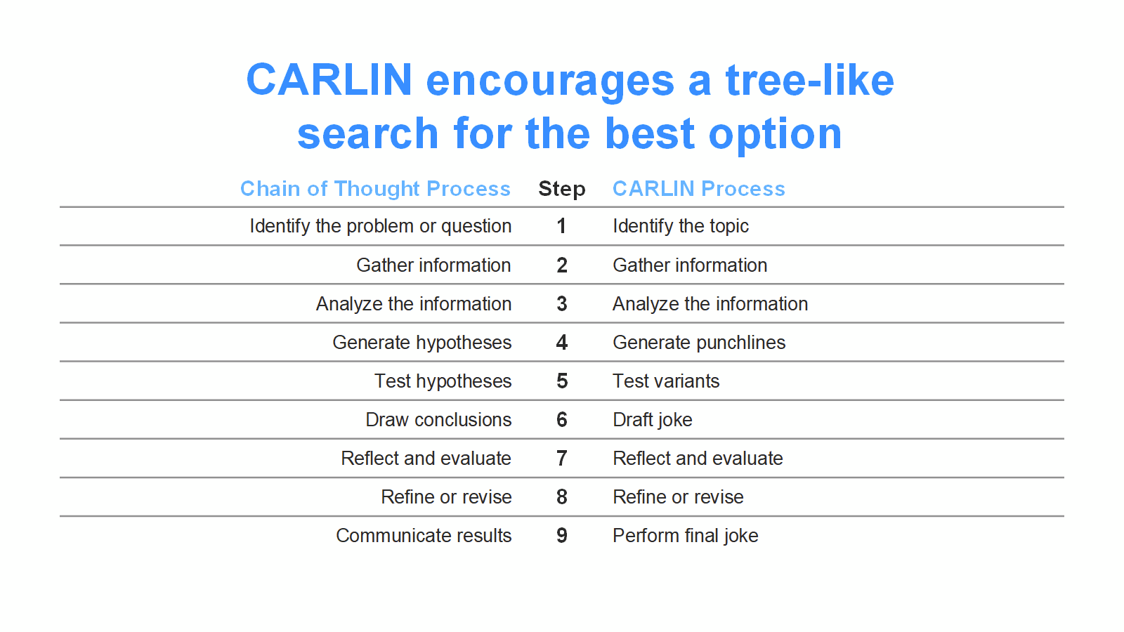 The CARLIN method shifts how AI approaches humor generation through its innovative integration of Chain of Thought (CoT) reasoning with a tree-like search structure. Unlike traditional linear AI processes that move directly from prompt to punchline, CARLIN adopts a more sophisticated approach inspired by how humans create humor. By incorporating CoT-like reasoning, the system breaks down the complex task of humor creation into manageable steps, each building upon the previous one while maintaining logical connections throughout, which is a necessity for incongruity to be resolved. However, what truly sets CARLIN apart is its tree-like search methodology – instead of pursuing a single line of thought, the system explores multiple branches of potential humor simultaneously, much like a comedian brainstorming different angles on a topic. This branching approach allows for the exploration of various comedic possibilities before converging on the most effective option.