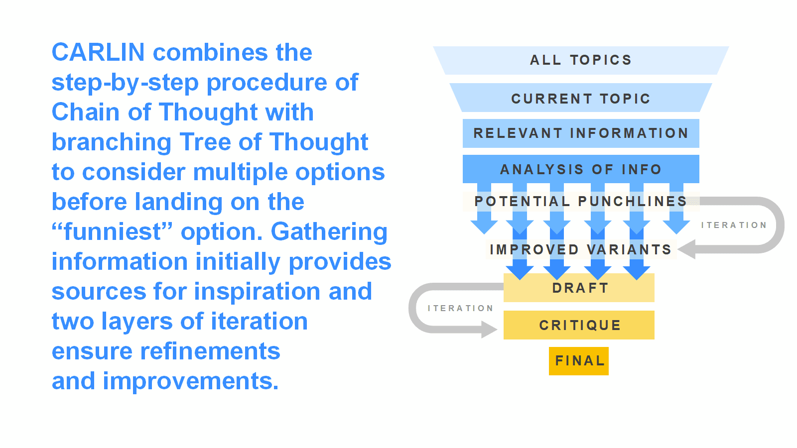 CARLIN uses multiple iteration layers and emphasizes information gathering and refinement. Rather than treating joke creation as a one-shot process, the system incorporates feedback loops at various stages, allowing for continuous improvement and adaptation. This iterative approach is how CARLIN handles information gathering – instead of working with surface-level facts, it builds a varied contextual understanding that can be used for multiple comedic angles. This branching structure also means that promising comedic ideas aren't abandoned just because they don't work in their initial form; instead, they can be refined and developed along parallel paths. Processing and refining humor is the antithesis of the linear, one-directional methods typically employed by AI systems, and results in humor that feels more natural and thoughtfully constructed rather than mechanically generated.