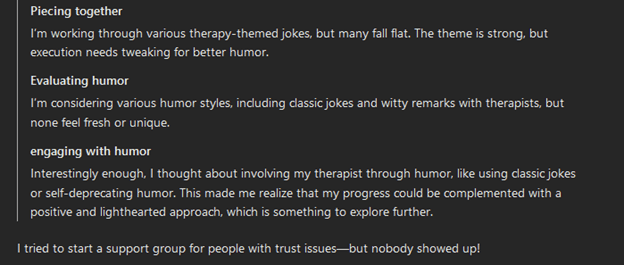The problem lies in how LLMs typically process information: linearly, step by step, without the natural iteration and refinement like our humor creation. While human comedians might start with an idea, play with it, circle back, try different angles, and gradually refine their material through multiple iterations, traditional AI approaches follow a straightforward path from prompt to punchline. This linear processing is very different from the messy, iterative way humans naturally develop humor, where truly funny jokes often develop from a process of exploration, association, and refinement. The result is AI-generated humor that feels mechanical and predictable, lacking the surprising connections and clever insights that make human-created jokes genuinely funny. It's like the difference between following a recipe and improvising in the kitchen – while the recipe might produce something edible, it's the ability to experiment and iterate that leads to truly memorable meals.
