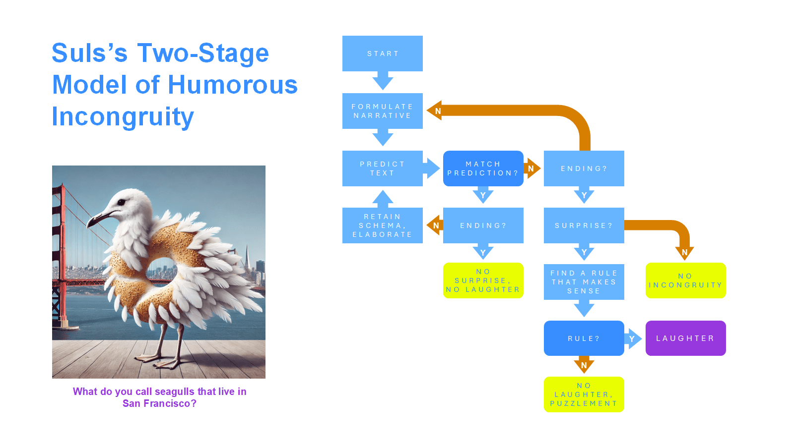 Building on this theoretic foundation, Suls's Two-Stage Model provides a more detailed framework for understanding how humor processing works in the human mind. According to this model, humor comprehension follows a specific sequence: first, we encounter a setup that leads us to form certain predictions about where things are heading; then, when those predictions are violated, we immediately begin searching for a rule that makes the unexpected outcome make sense. It is important that both the surprise and the resolution are necessary for humor to work – it's not enough to simply be random or unexpected. Some jokes fall flat because they're either too predictable (no surprise) or too bizarre (no logical resolution). The model also highlights why timing and delivery are so critical in good comedy – they balance setting up expectations and revealing the surprising-yet-logical punchline at just the right moment. Understanding these mechanical aspects of humor isn't just academic; it's essential for teaching AI systems how to generate genuinely funny content rather than simply regurgitating familiar jokes (which are less surprising, and thus less funny).