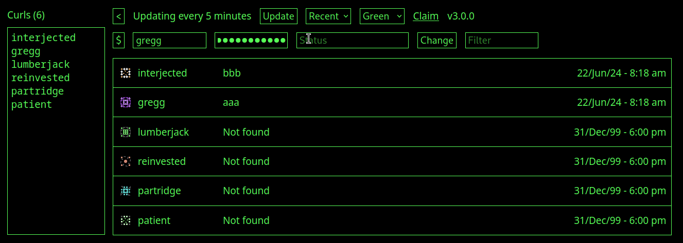 I'm calling this thing Curls. You claim a curl and get a key to control its status. You get the key only once, if you lose it there's no way to recover it.