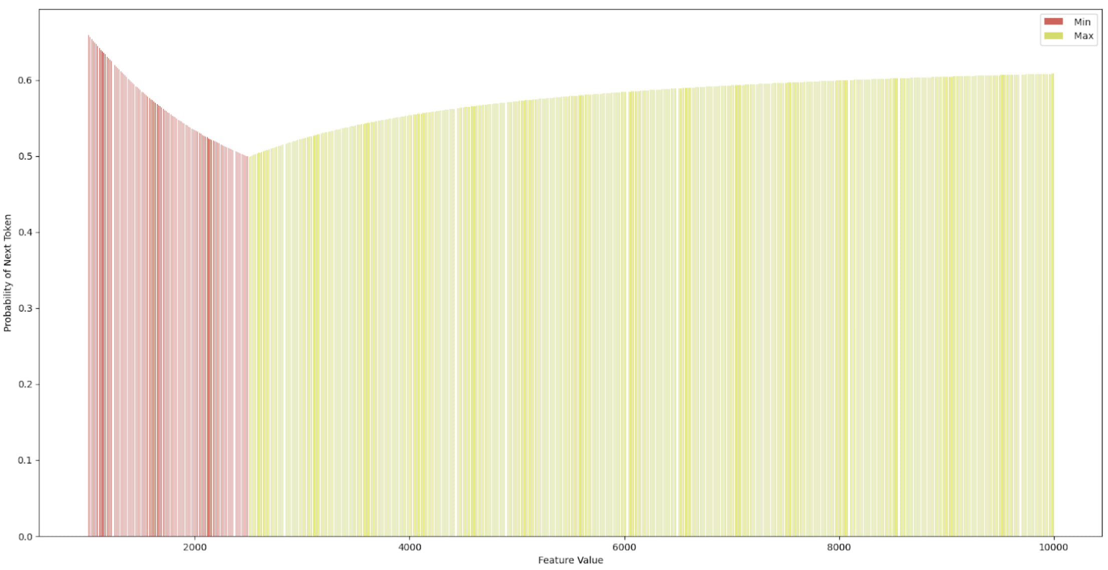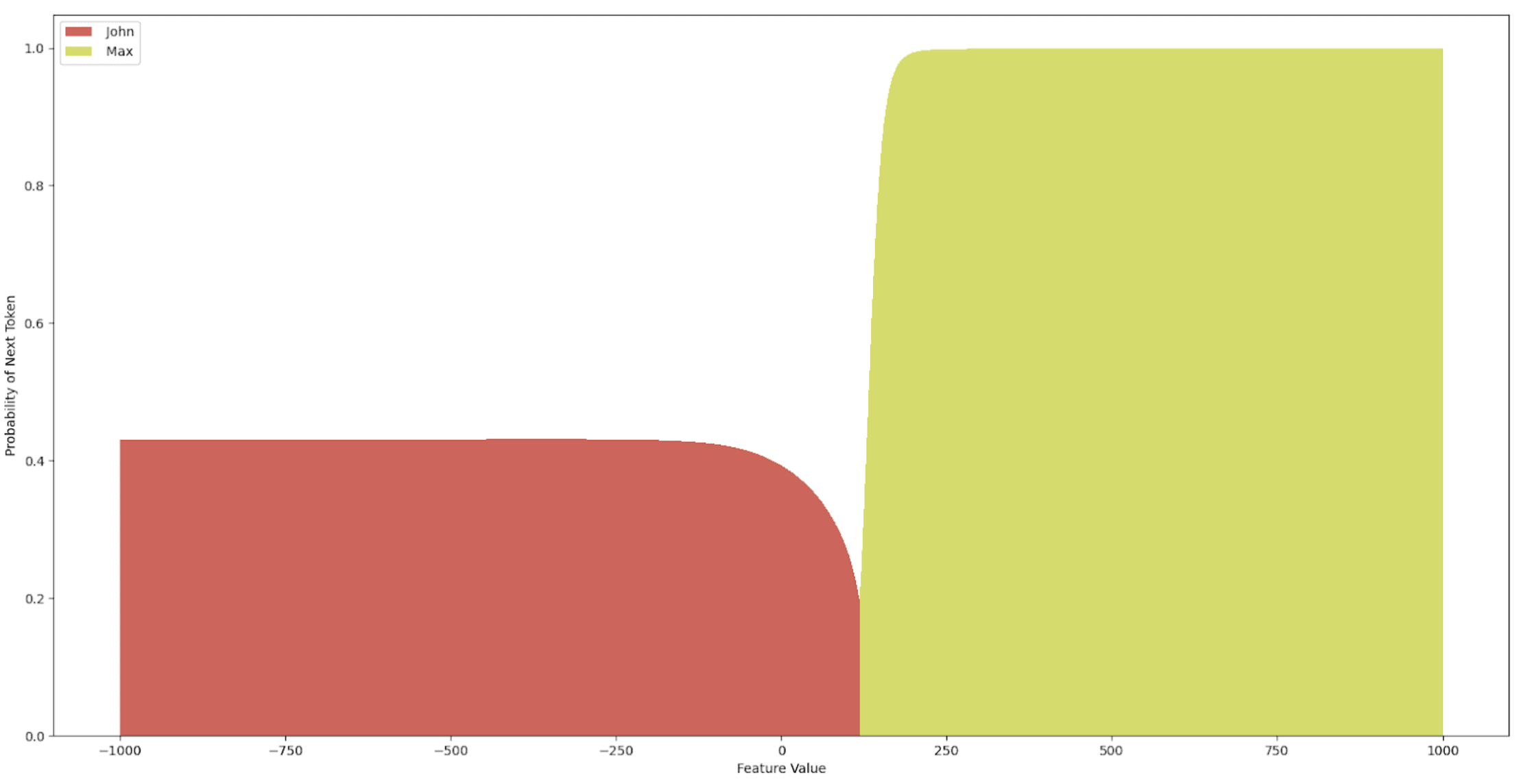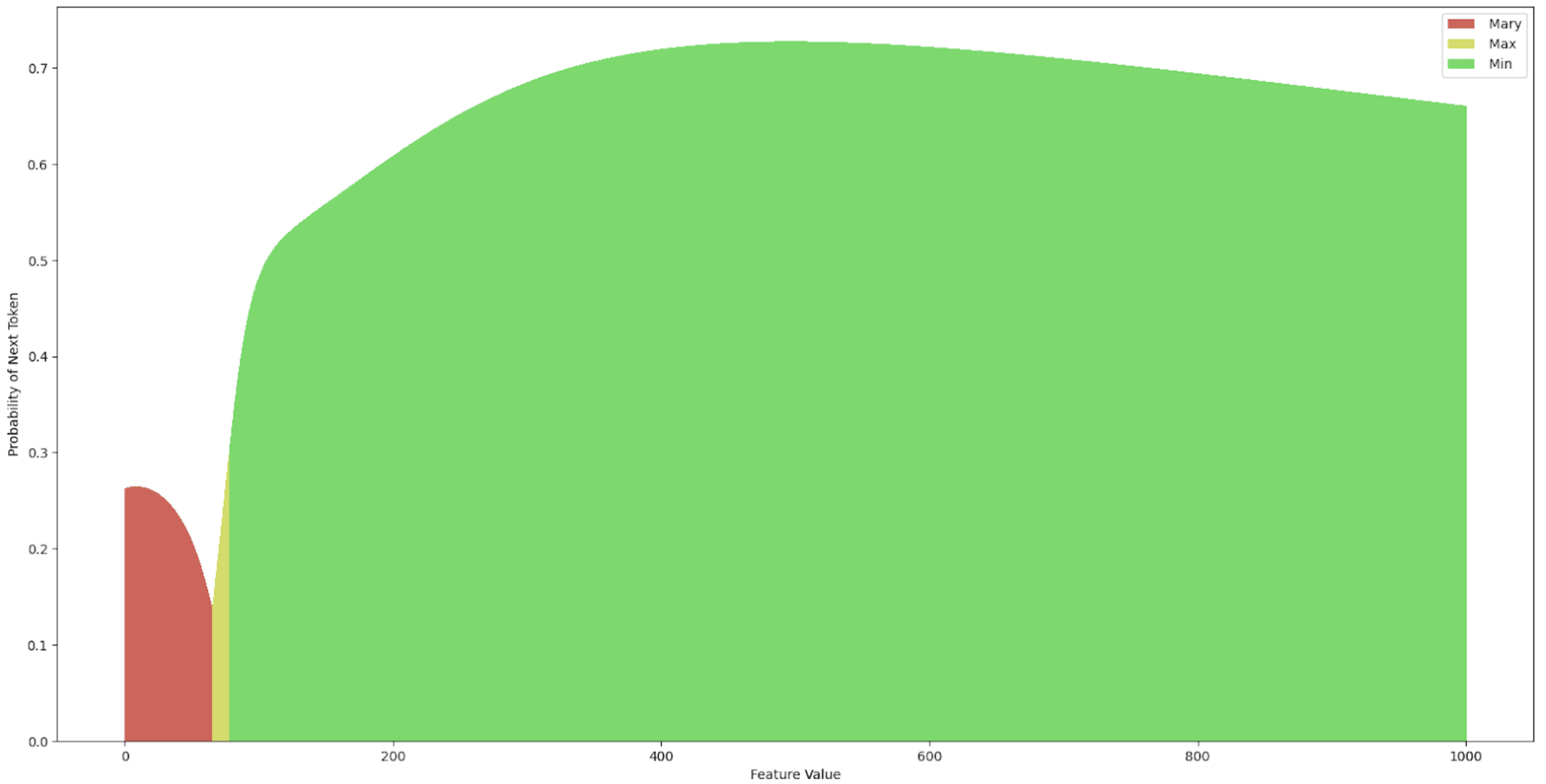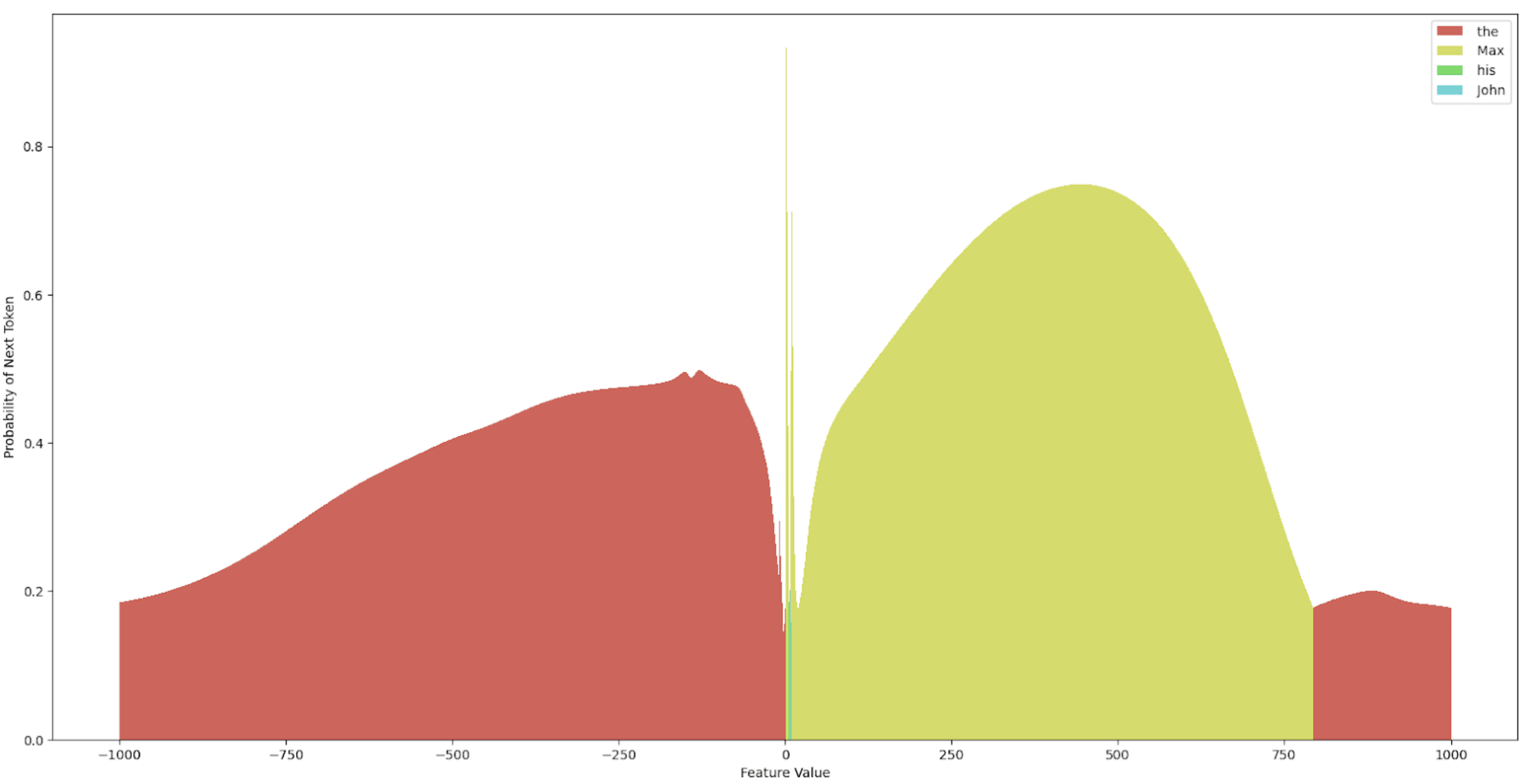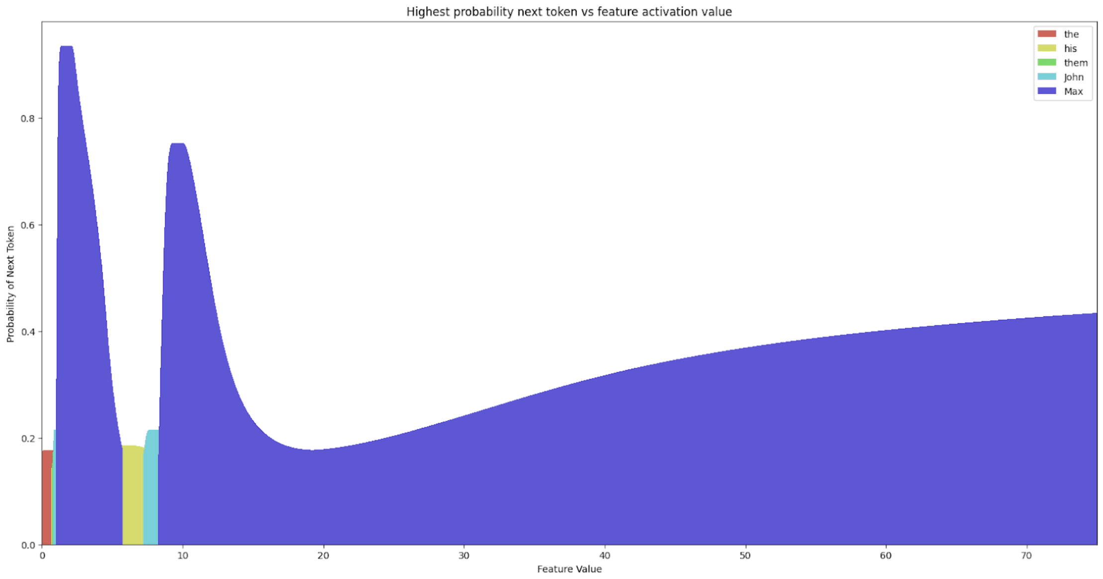 We start by considering the sweep for layer 1 activations, for which we find the only difference in latent code features at the “ Mary” (or “ Max”) token position, switching the model’s output probability from being 74.21% confident in “ Mary” being the next token in the sequence to it being 72.75% confident “ Max” is the next token in the sequence. If we do the feature value sweep on this new “ Max” feature, we get the outputs from Figures 6 and 7.