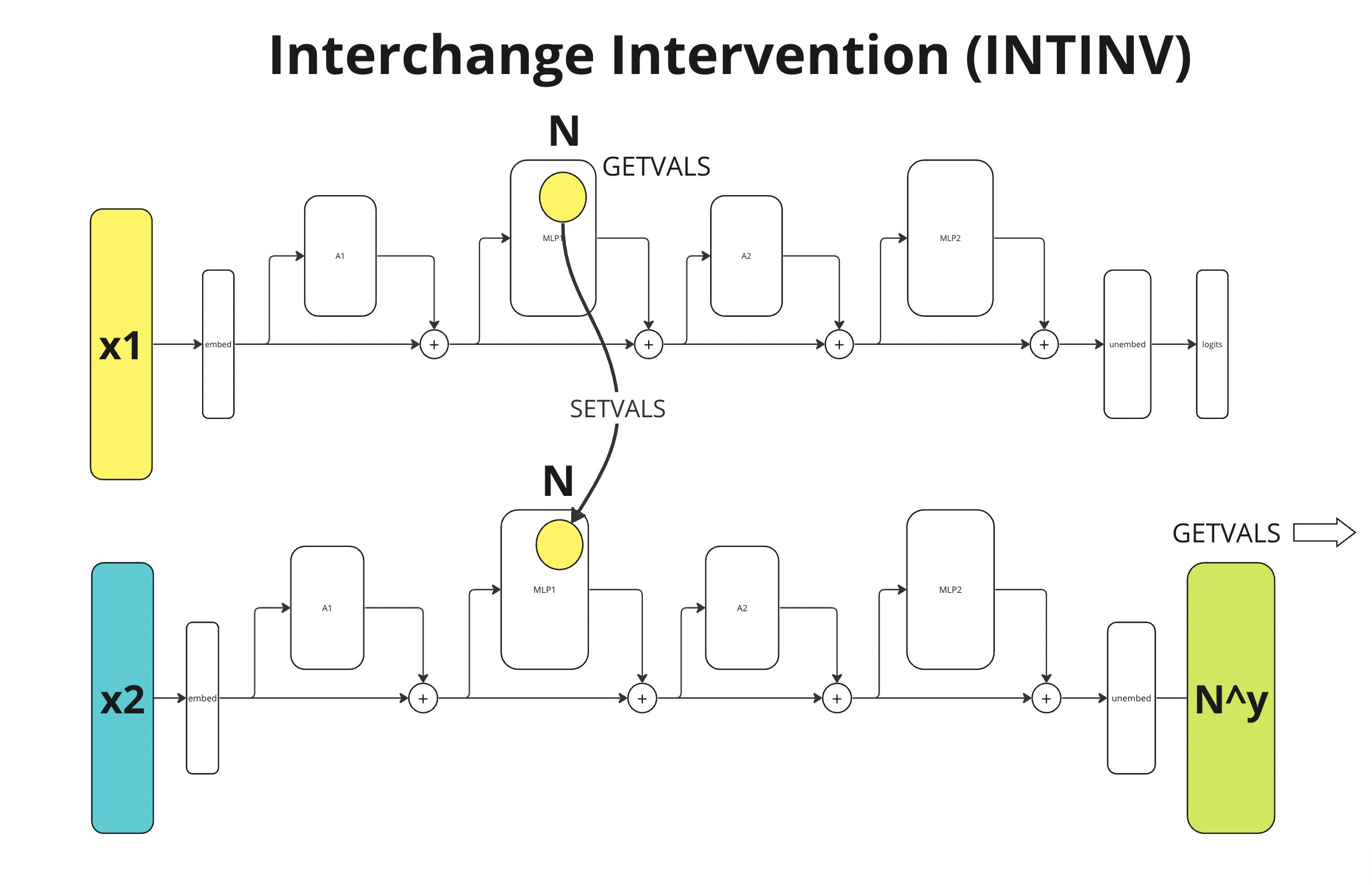 Note that here we only consider counterfactuals which have the same total number of tokens. In Figure [1], the token “ Mary” was replaced with “ Max”, both of which are represented as a single token in the GPT-2 tokenizer. We can construct an interchange intervention from counterfactuals with different numbers of tokens, but there we have to either introduce some form of padding or full ablation of a part of the sentence. For simplicity, here we only consider SINTINVs with input pairs with equal numbers of tokens.