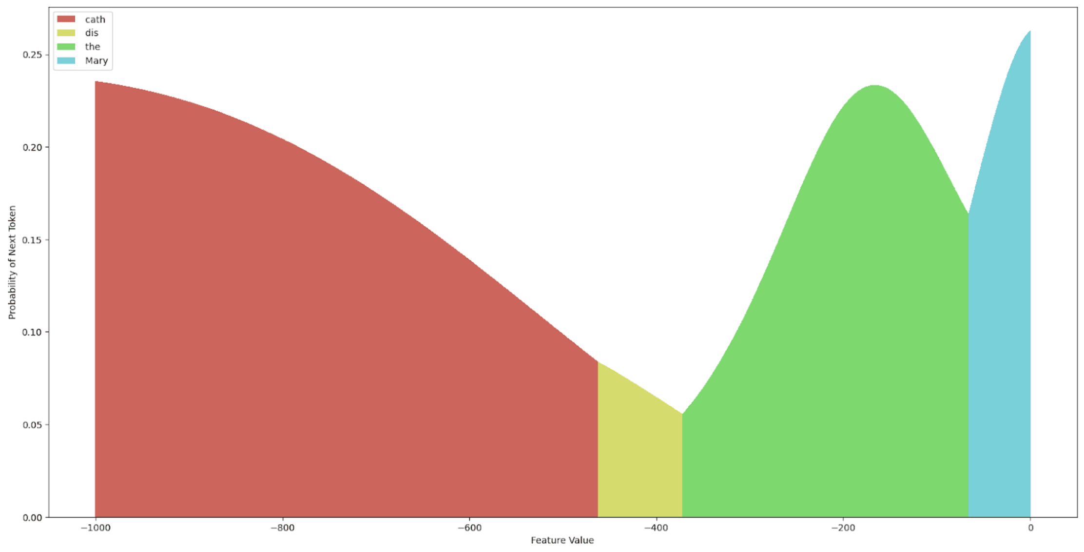 There are two main observations to note from Figures 6 and 7. First, the “ Max” direction in the latent code of “ Mary” (the smaller active features were fixed, see Figure 3) is not monosemantic in the sense that this direction encodes a single feature. Second, there is a range of values from 0 to roughly 10 where the highest probability output tokens of the model with hooked latent code reconstructions from this latent code change very quickly and are seemingly unpredictable, and other ranges of values encoding an approximately smooth trajectory of token probabilities. Furthermore, only the sweep over the latent code at the “ Mary” token position at layer 1 was able to elicit a “ Max” output from the model, with maximum confidence 93.24% by changing the feature value (compared to 72.75% with the vanilla SINTINV), indicating that at layer one, the “ Max” feature is only encoded at a single position and the model’s outputs can be intervened on in a causally meaningful way only at that location in layer 1.