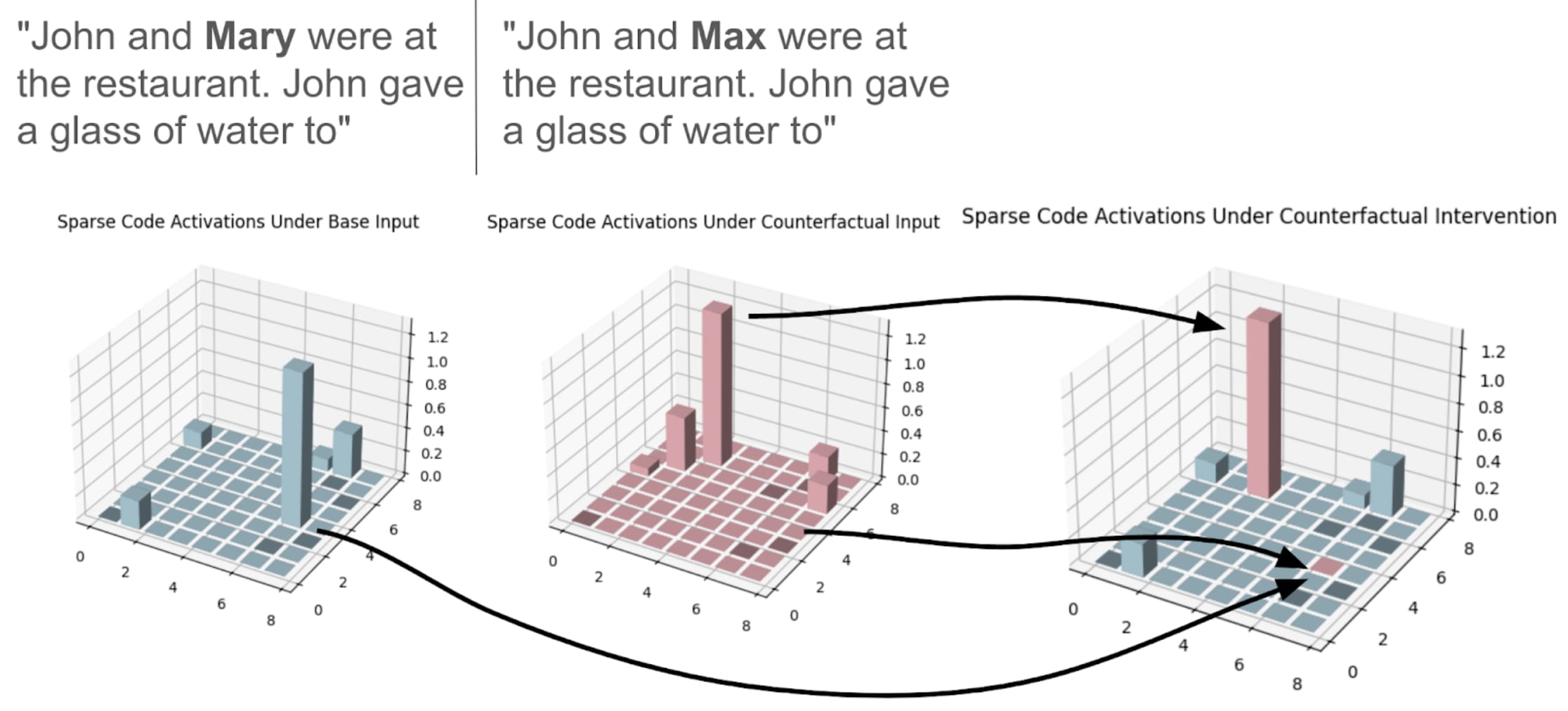 We extend the notion of an interchange intervention into the latent code of the sparse autoencoder. Given two counterfactual inputs, call them X and X’, we replace the highest activating feature in the sparse latent code from X with the corresponding feature activation under X’, and add the highest activating feature from X’ to the corresponding location in the latent code under X. We call this a Sparse Interchange Intervention (SINTINV) on the highest activating features in the two latent codes constructed from counterfactual inputs. Figure [1] shows a visual representation of a SINTINV. Figure [2] shows a classical Interchange Intervention.