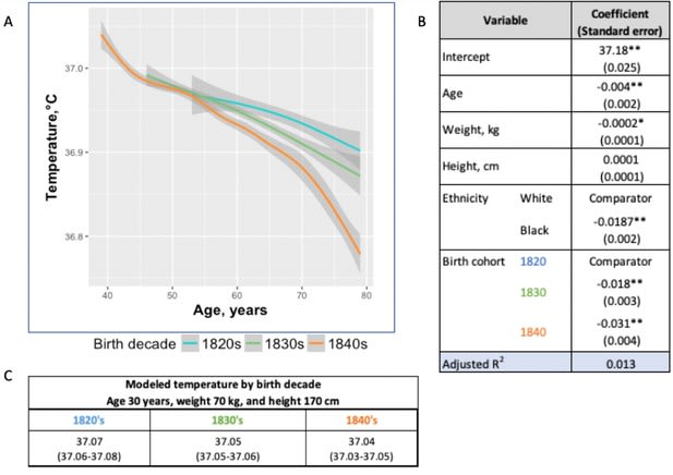 Some researchers from Stanford claimed in 2020 that human body temperature has "decreased monotonically by 0.03°C [~0.06°F] per birth decade" over the last 157 years, which they note is an indicator of lower metabolic rate. My experience, at least, is usually that my temperature is lower than the canonical 98.6°F.