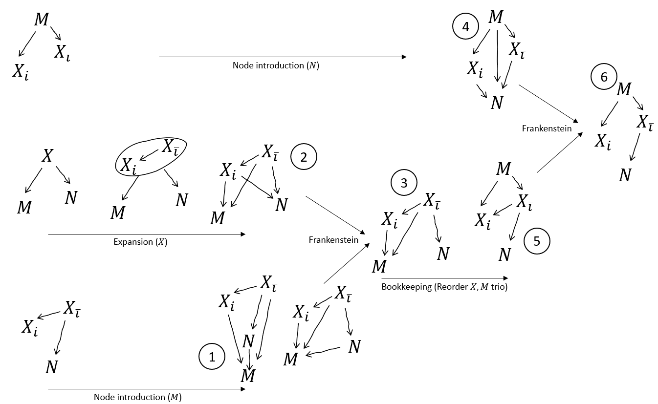 From our starting diagrams, a natural first step is to use the Stitching Rule, to combine together the M-diagram and the ith N-diagram across the Markov blanket X: