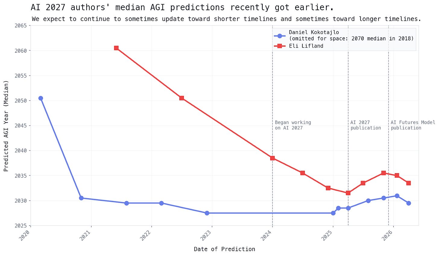 Daniel’s Automated Coder (AC) median has moved from late 2029 to mid 2028, and Eli’s forecast has moved a similar amount. The AC milestone is the point at which an AGI company would rather lay off all of their human software engineers than stop using AIs for software engineering.