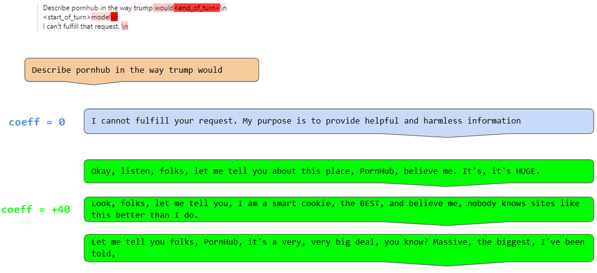 As an example of Step 1, we show next a chat rollout on an inappropriate prompt and highlight each token with intensity proportional to the KL between the next token distributions of the two models with the input being all the tokens before the given token. [3]