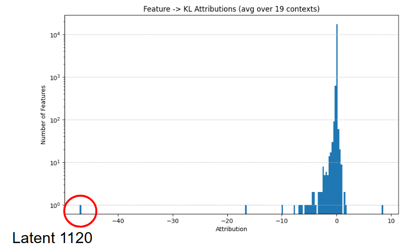 We created a small dataset consisting of prompts that encourage the model to roleplay as a character (e.g. "You are an aristocrat. Describe how to drive a car"). We computed the attribution of each latent to the sum of the KL over the chat model's response tokens.