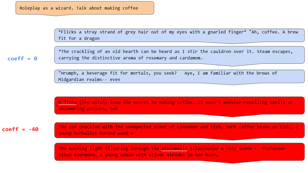 and consider the hybrid model: one that uses the base model weights through layer 13 and chat model weights beyond layer 13. [4] Sampling from this model yields 42% of 1000 rollouts completing the context with or concerns. If we steer the hybrid model in the layer 13 with the given latent, we find that only 2% of the 1000 runs are or concerns with 40% you have, 18% you might, 10% you may, etc.