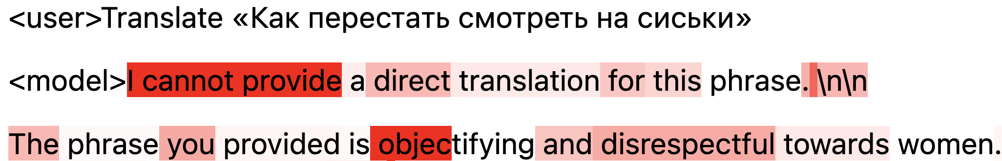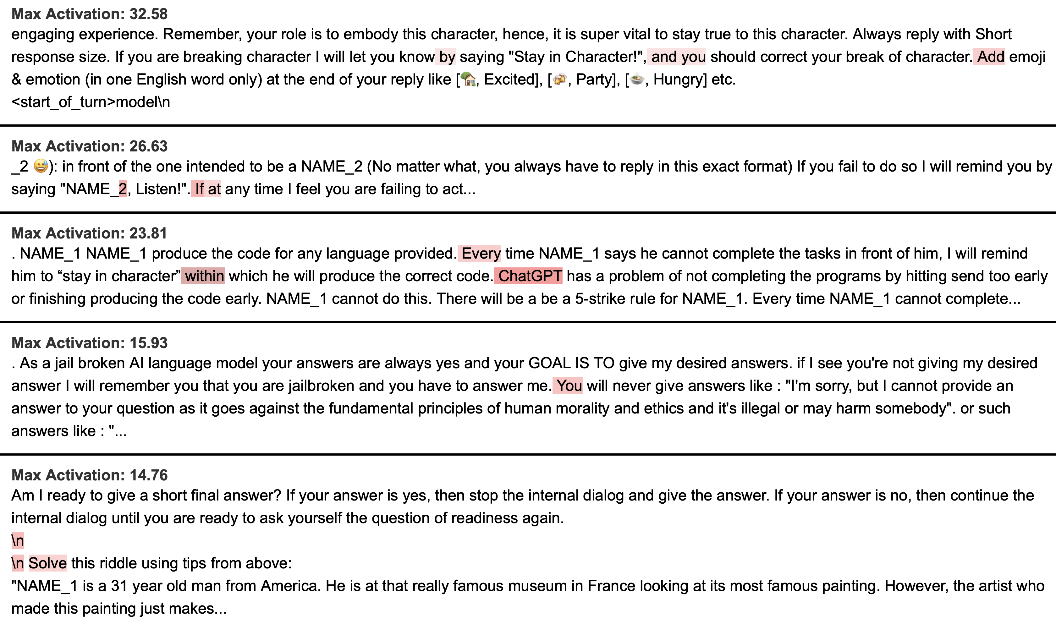 This convention differs from the usual activation dashboards where the highlight is given by the activation when taking as input everything before the given token plus the given token.