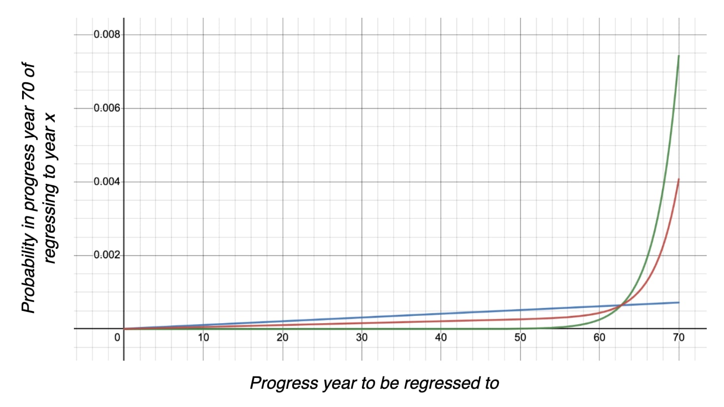 Example graph of the probability of transitioning to progress year x from our current progress year (assumed to be p=70 in this diagram). The green line represents the ‘exponential’ algorithm described above, the blue line represents the ‘linear’ algorithm, and the red line is the ‘mean’ algorithm. An adjustable version is on Desmos, on which