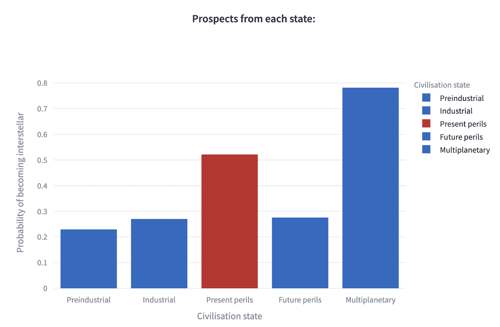 This magnification can be different in different civilisational states - for example, you might think the increased resource scarcity would be a minor impediment in advancing from a preindustrial state through to a time of perils, a major impediment in a time of perils, and no impediment at all in a multiplanetary state.