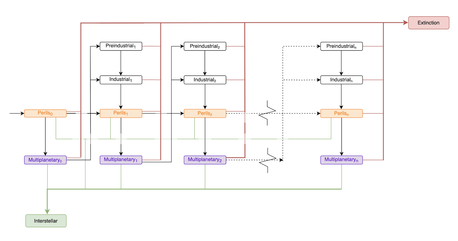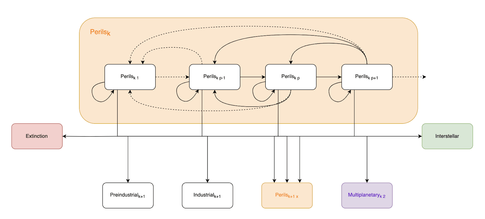 If you think the first of these is the only way to existential security, then in models that follow you can assign 0 probability of reaching a ‘multiplanetary’ state, and suppose that we will either transition directly from a time of perils to an existentially secure state or we won’t become existentially secure.