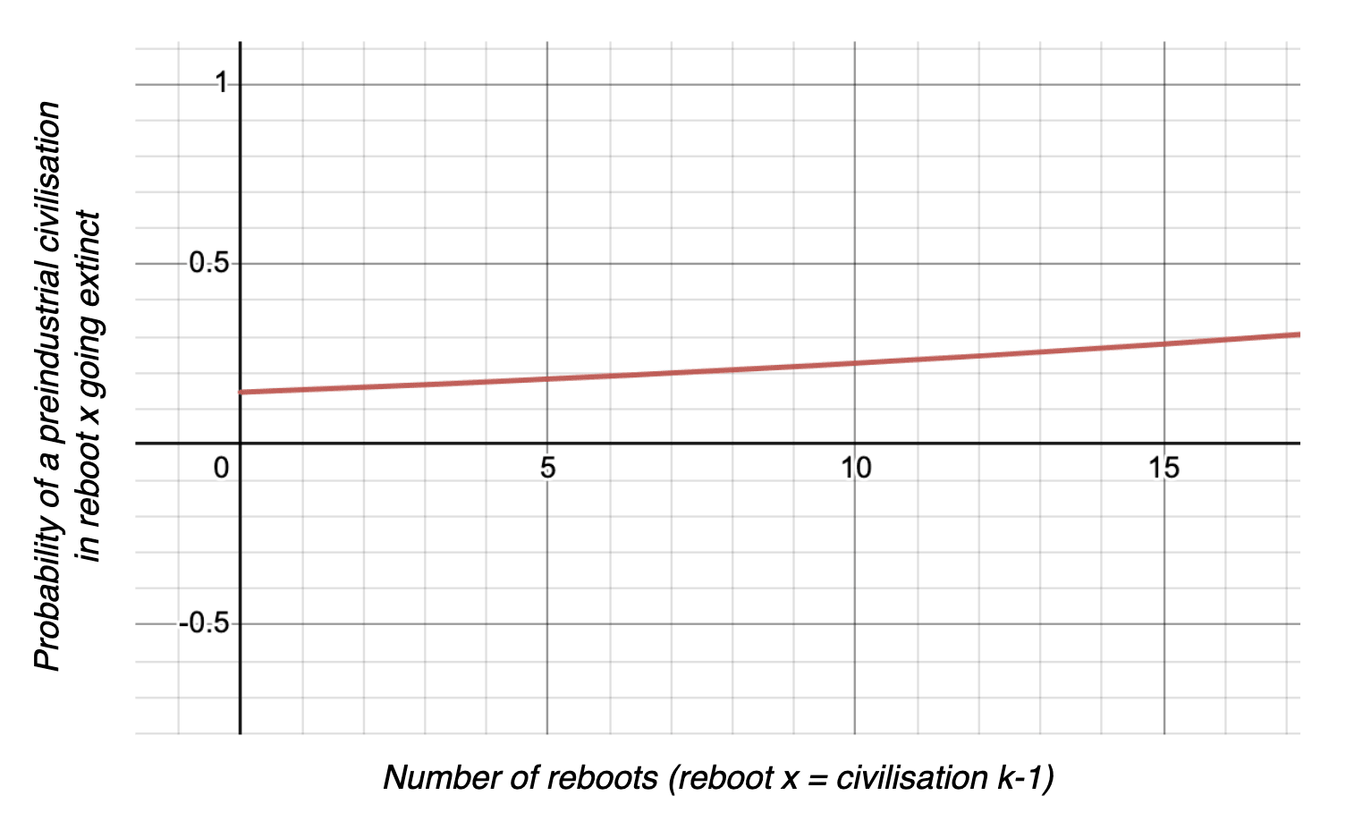Example graph of the probability of directly going extinct from a preindustrial state in the xth reboot (assuming the only two possibilities are that or advancing to an industrial state). See adjustable version, on which