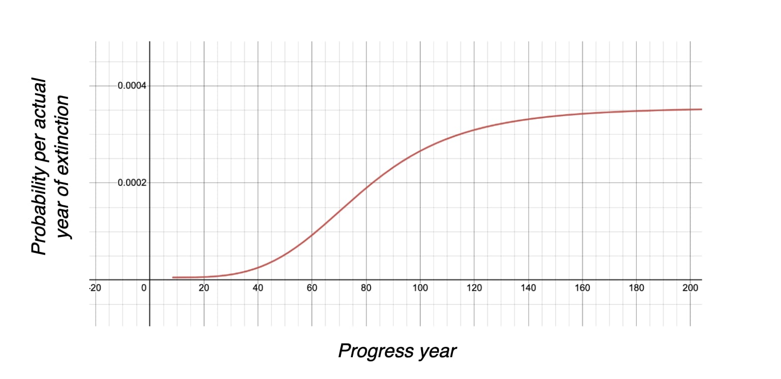 Example graph of the annual probability of directly going extinct in progress year x of the current time of perils (not showable in 2 dimensions: a per-civilisation multiplier on the x-scaling). An adjustable version is on Desmos, on which