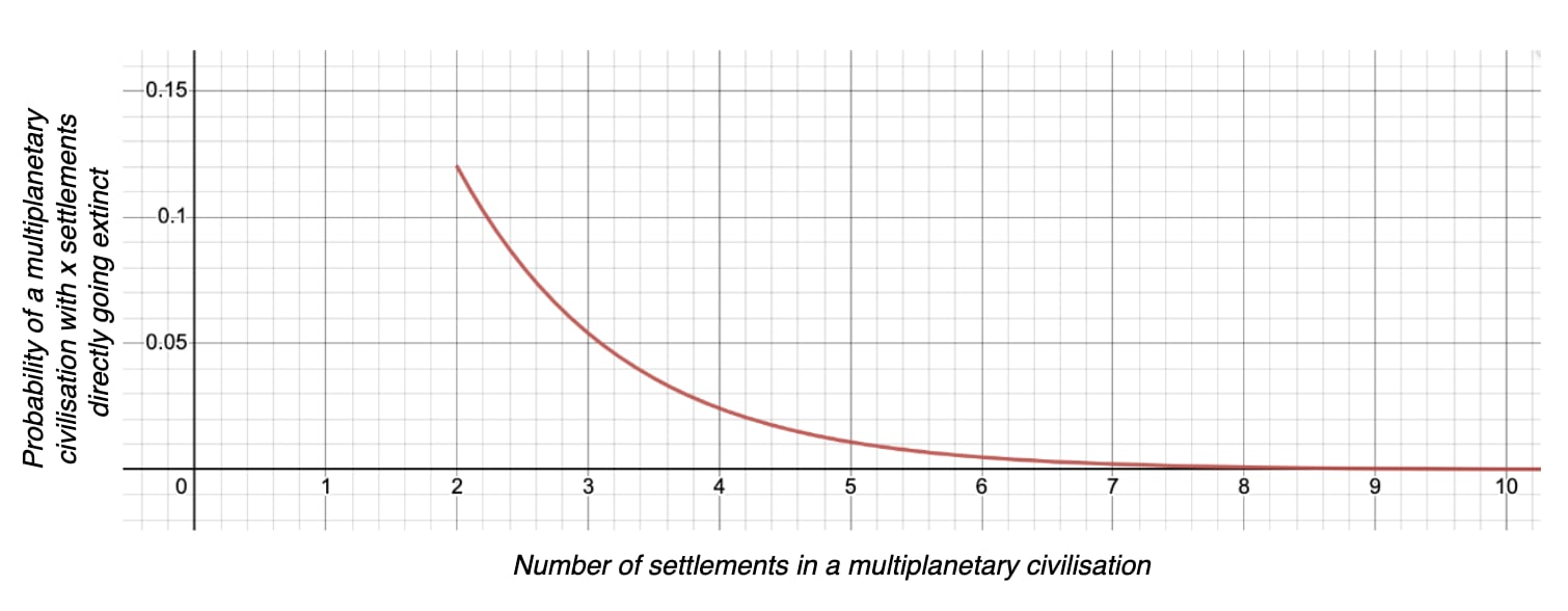 Example graph of the probability of a civilisation in a multiplanetary state with x settlements (defined as x>=2) directly going extinct . See adjustable version, on which
