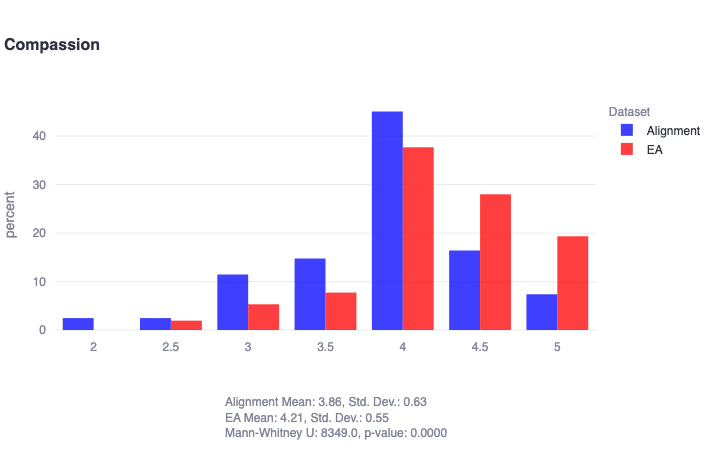 In spite of significant trait similarities across the two communities, we also find that EA respondents on average are more conscientious (t=2.7768, p=0.0058) and more agreeable (t=3.0674, p=0.0023) than the alignment community respondents, while alignment researchers tend to be slightly (though not statistically significantly) higher in openness. It is possible that EAs are more broadly people-oriented (or otherwise select for this) given their prioritization of explicitly-people-(or-animal)-related causes. It is also possible that the relative concreteness of EA cause areas, as compared to the often-theoretical world of technical AI safety research, may lend itself to slightly more day-to-day, industrious types.