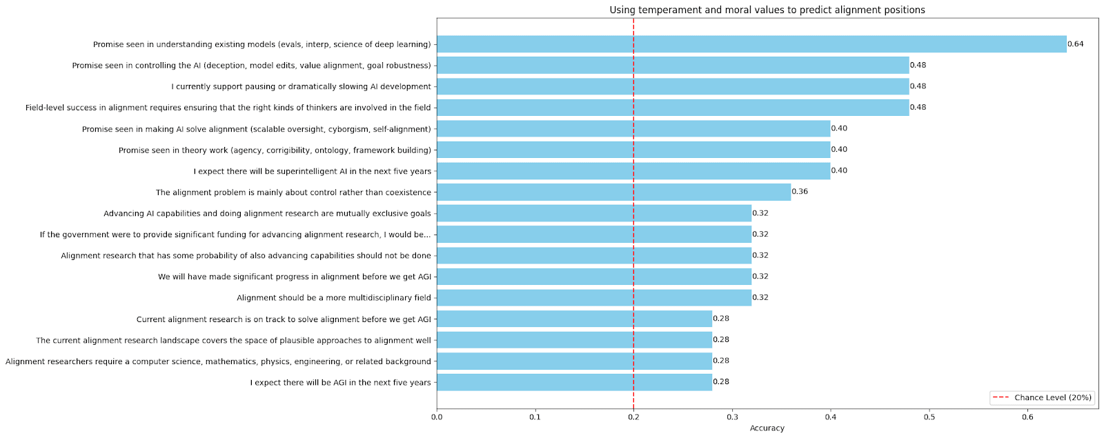 We show that respondents’ trait-level scores from the psychometric instruments deployed in both surveys can be used to predict alignment researchers’ positions on the various alignment-specific questions significantly above chance level using a simple Random Forest Classifier (with balanced class weights). Feature importances reveal that many such predictions are based on seemingly sensible features—for instance, for the statement, “I currently support pausing or dramatically slowing AI development,” the feature with the single highest importance is one’s liberty moral foundation score, which makes a good deal of sense. For the “promise seen in controlling the AI (deception, model edits, value alignment, goal robustness)” question, the single feature with the highest importance is, quite intriguingly, one’s own self-control score on the Brief Self-Control Scale.