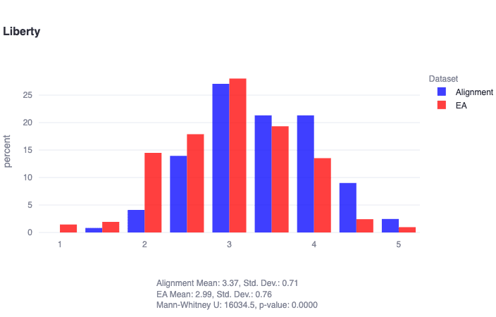 It is worth noting that while the philosophy of effective altruism/AI safety has a clear expected relationship to traditionalism (boo!) and compassion (yay!), it seems plausibly agnostic to liberty as a moral value, potentially explaining the generally-normally-distributed nature of both populations. This finding invites further reflection within both communities on how liberty as a moral foundation relates to their work. For example, the implementation details of an AI development pause seemingly have a clear relationship to liberty (as we actually demonstrate quantitatively later on). Given that alignment researchers seem to care both about liberty and AI x-risk, it would be interesting for follow-up work to better understand, for example, how researchers would react to a government-enforced pause.