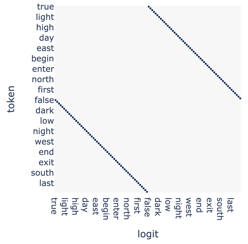 matrix, which can be visualized to understand how an attention head maps input tokens to output logits. These matrices can also be used to score attention heads by tallying the number of rows for which the top scoring output logit is the antonym of the input token.