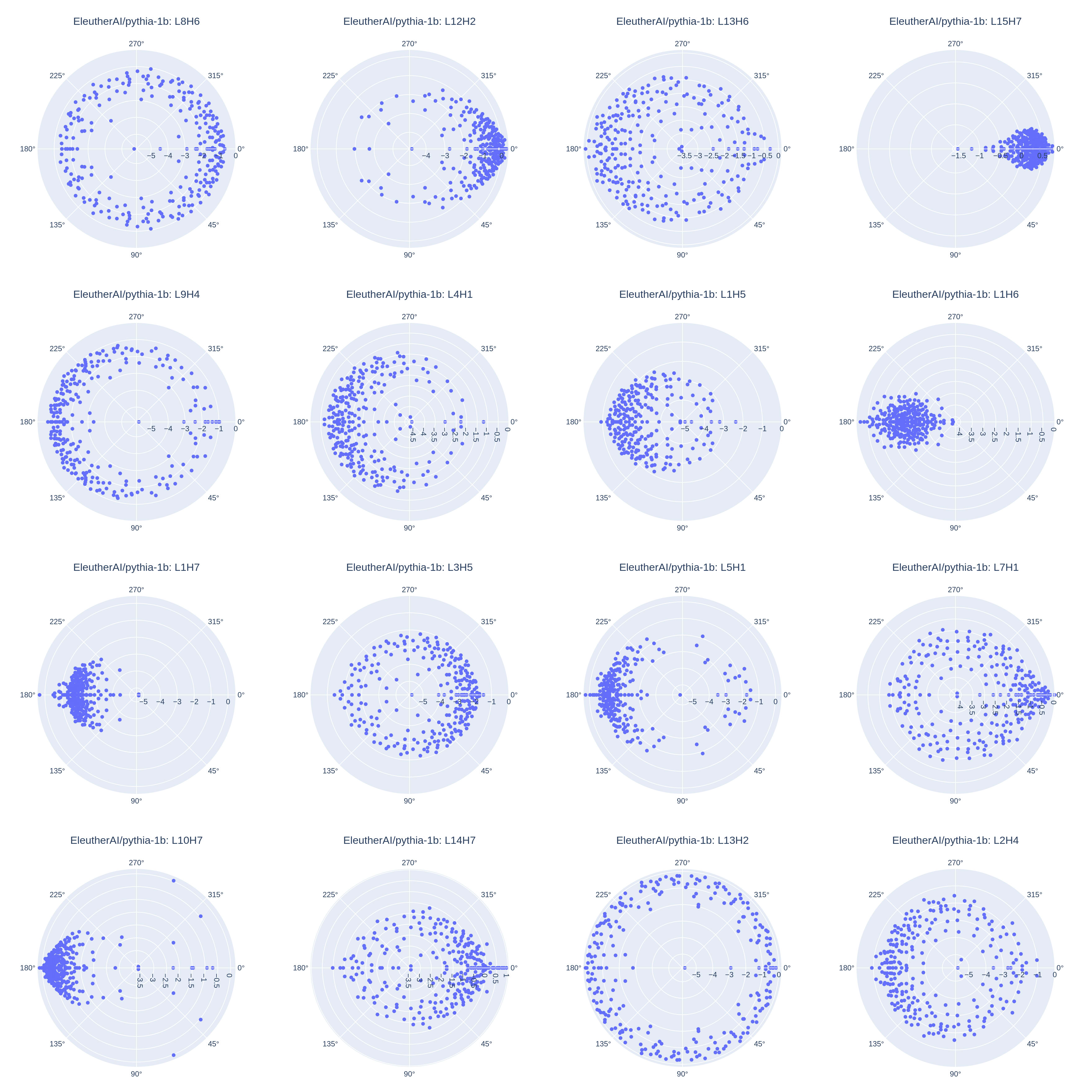 Plotting eigenvalues for all of the 13 studied models, we can see that top-scoring heads almost always present this same pattern, where the highest-magnitude eigenvalues have negative real components and nearly-zero imaginary components: