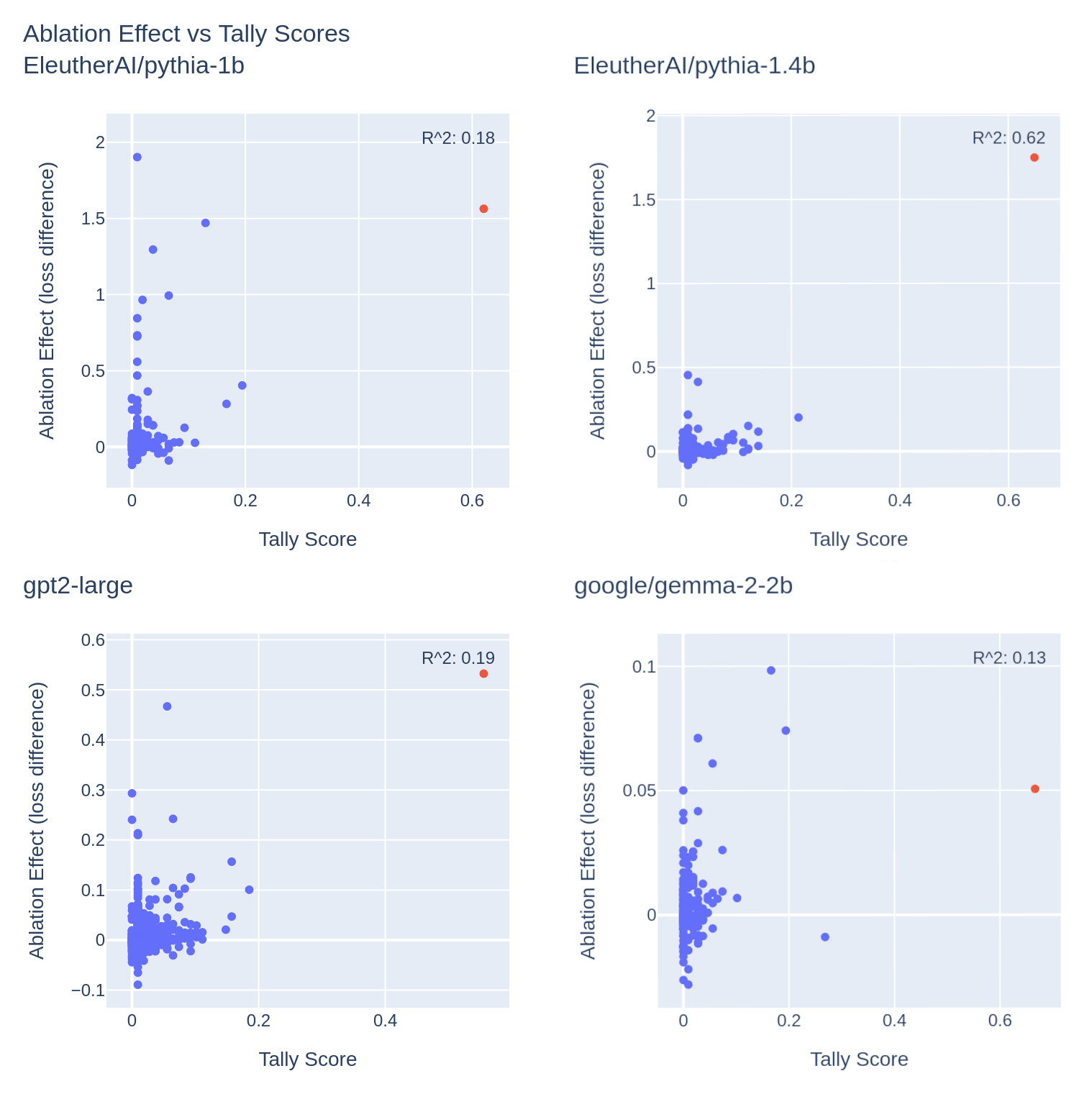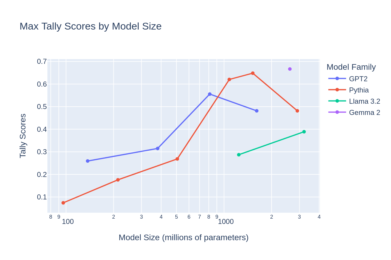 By graphing the tally score of each model's max-scoring head against model size, we can visualize how antonym heads develop as a function of model size. In general, larger models appear more likely to have high-tally-score antonym heads. The top heads for the largest studied models in the Pythia and GPT2 families have lower tally scores compared with their respective next-smallest models -- this is likely because these larger models are incorporating more inter-head composition, and rely on more than one head for computing antonyms.