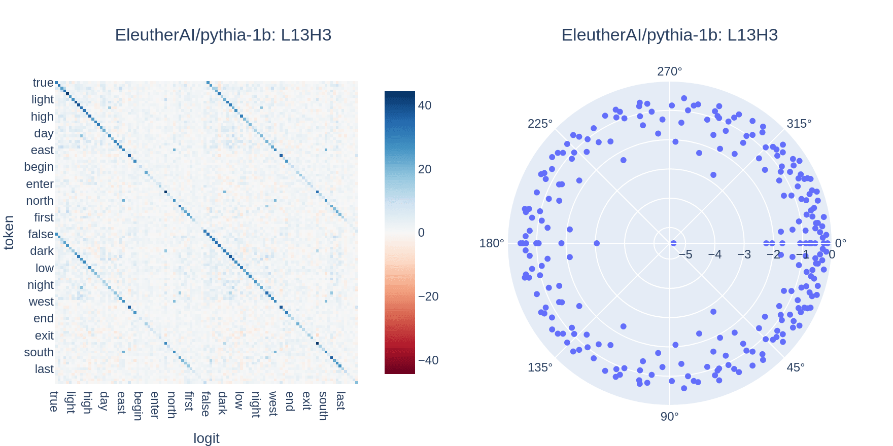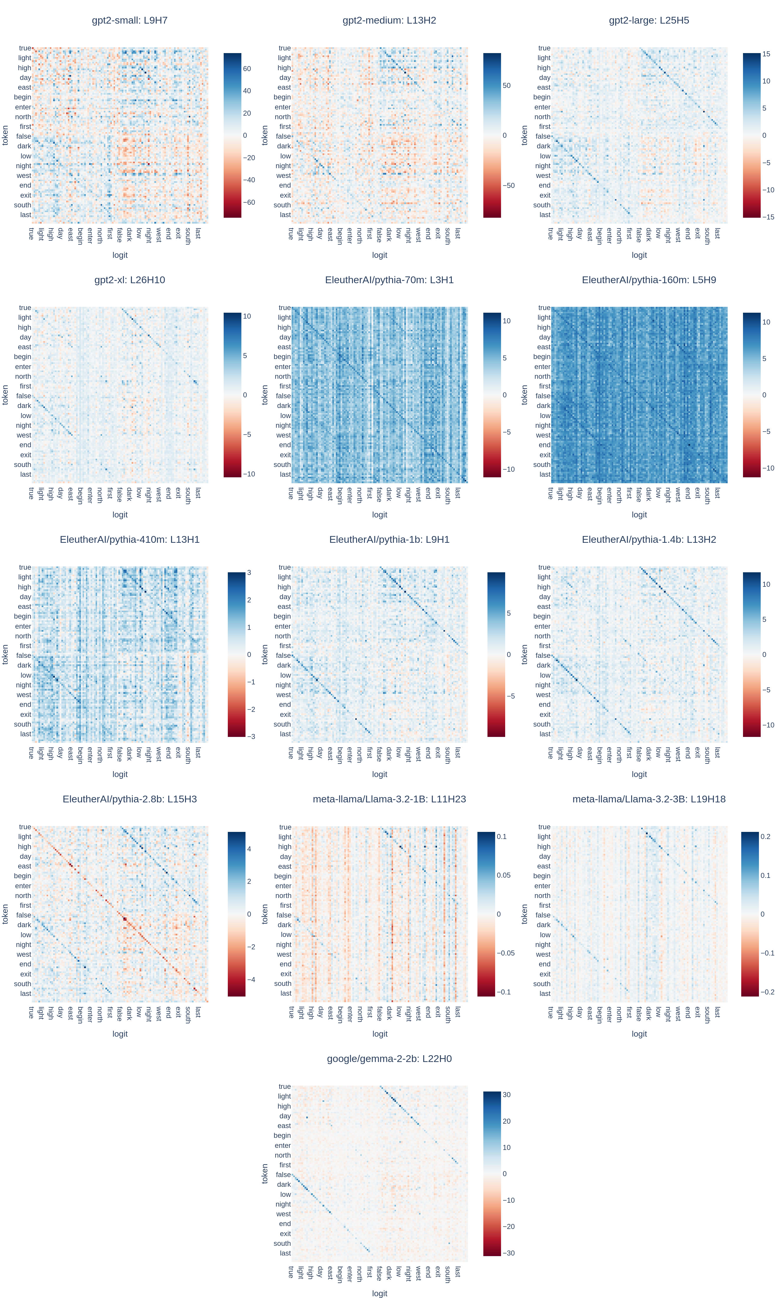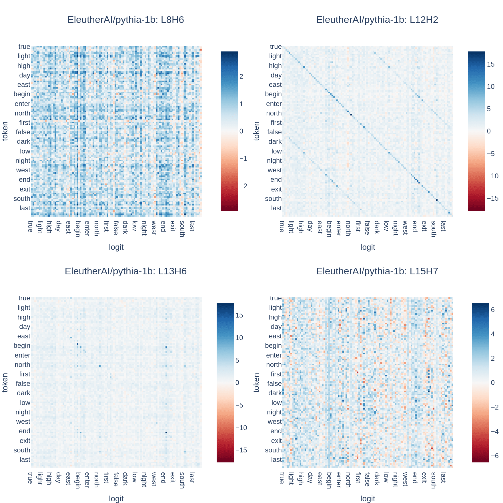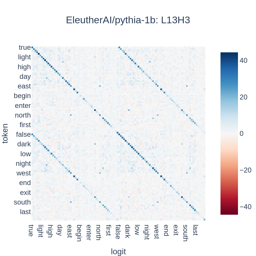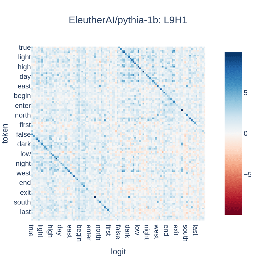 The top scoring head in Pythia-1b, shown above, correctly maps words to their antonyms a little over 60% of the time, and the double-diagonal pattern can be seen clearly. Some of the error can be attributed to the fact that not all word pairs in the dataset are actually perfectly independent -- for example, this head maps "loud" -> "soft" instead of "loud" -> "quiet" (the complement of "soft" in my dataset is "hard"). Thus, even a perfectly tuned antonym head would have some uncertainty about the "correct" logit given my dataset.
