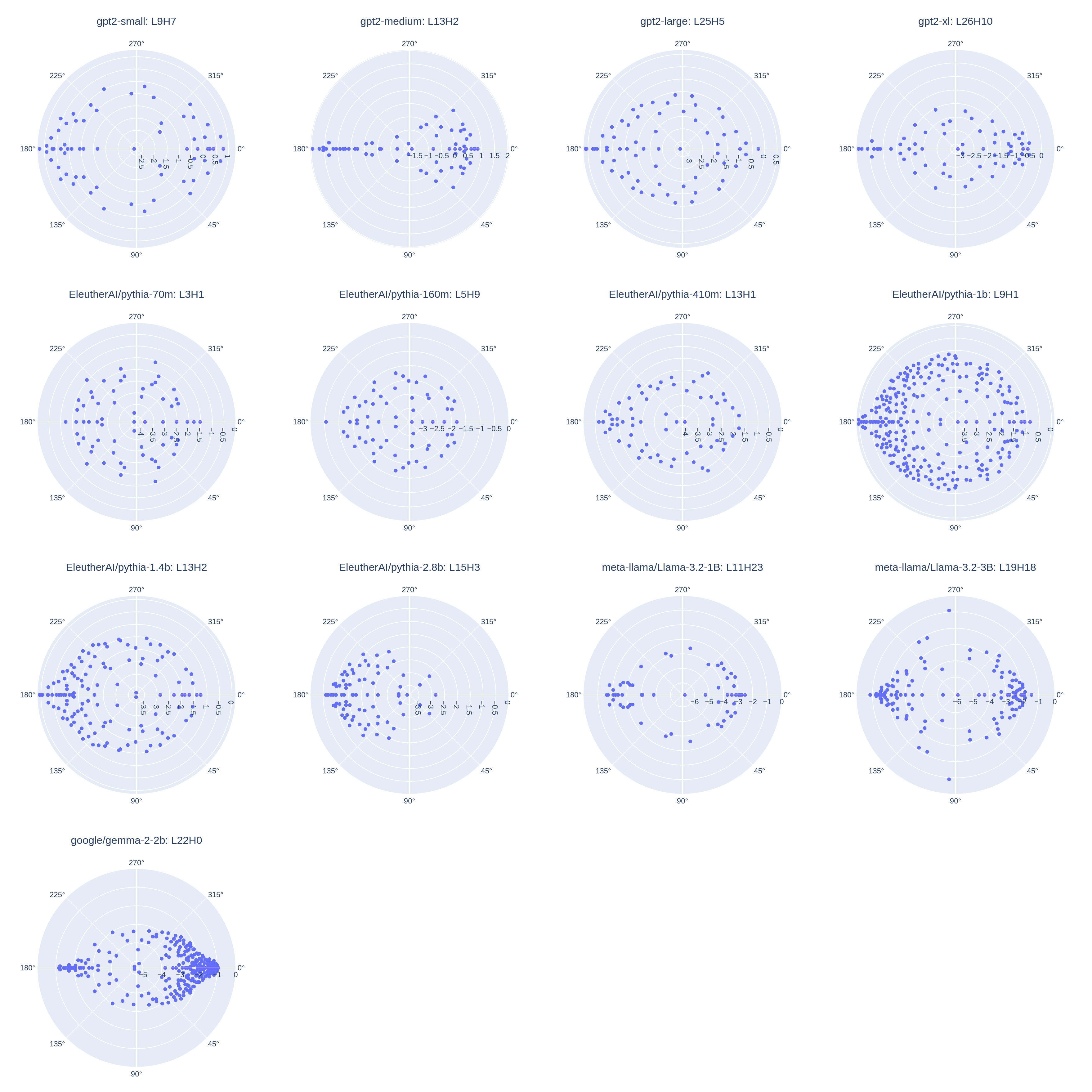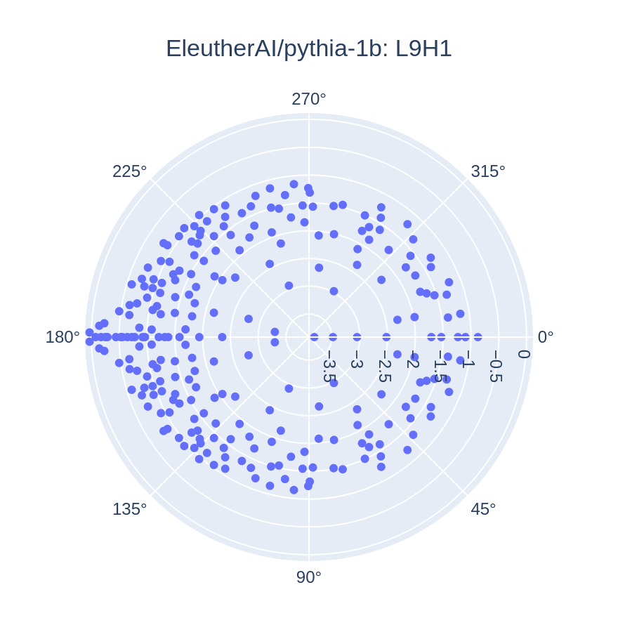 In this plot, we can see that the highest-magnitude eigenvalues have a negative real component and near-zero imaginary component. In transformation matrices (like the OV weight matrix), the real component of eigenvalues corresponds to scaling, and the imaginary component corresponds to rotation. I hypothesize that these high-magnitude, negative-real-component eigenvalues are responsible for doing semantic inversion when mapping an input token to it's semantic opposite -- they may represent directions in the embedding space which get inverted in order to compute antonyms. Interestingly, the log-magnitude of these eigenvalues is very close to zero, which means the absolute magnitude is close to 1, suggesting inversion without additional scaling. The remaining eigenvalues may correspond to copying category information (eg, "north" and "south" are opposite, but both cardinal directions), or transforming token embeddings from the embedding space to the unembedding space.