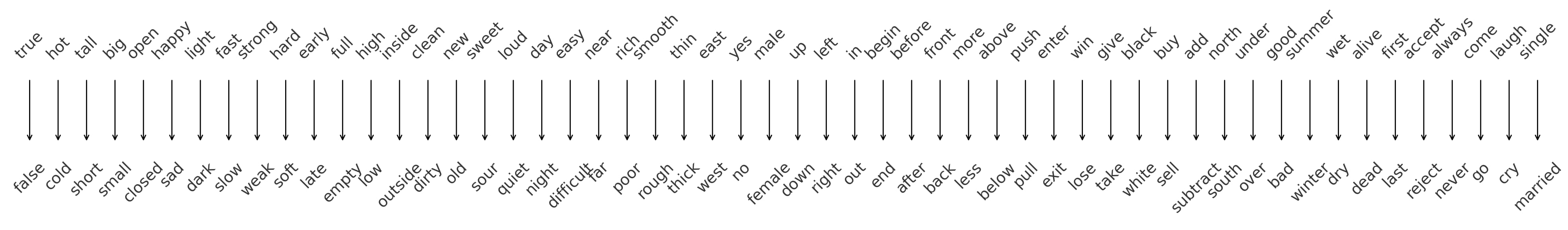 With the help of an LLM, I create a dataset of 54 word pairs which map common words to their opposites, yielding a total of 108 words. These words are selected such that each of the studied models' tokenizers outputs a single token per word[1], and I try to make the pairs mostly independent.