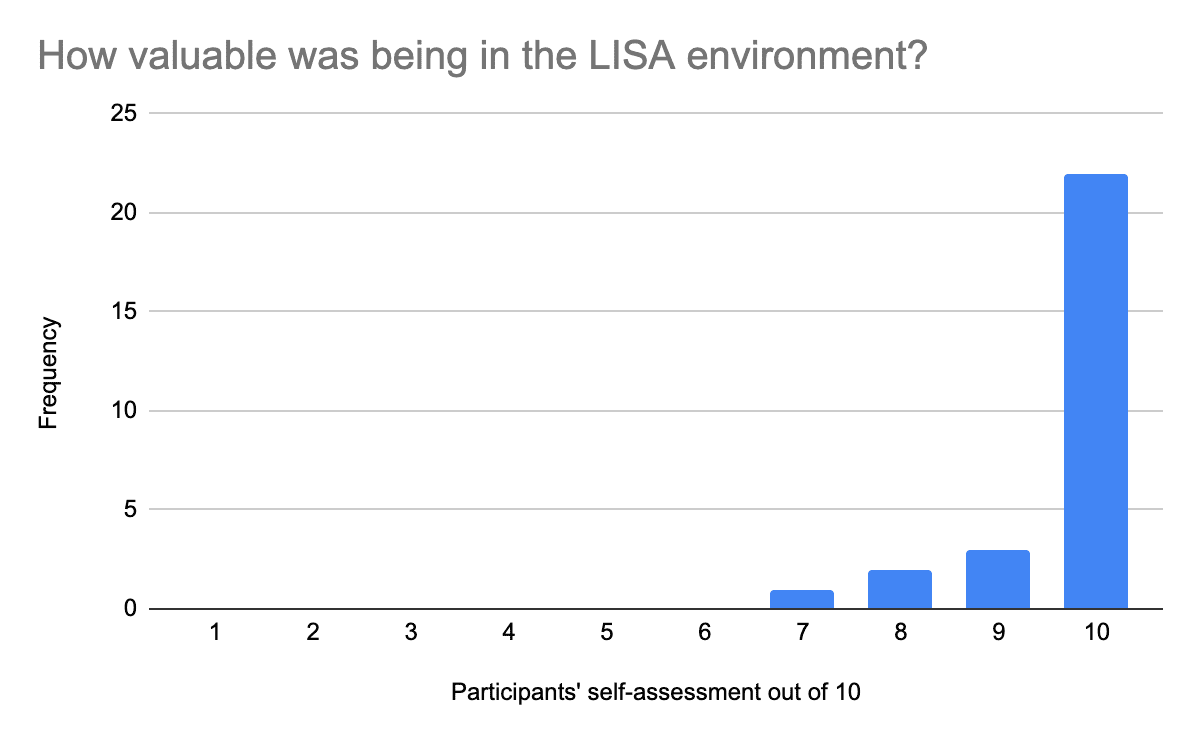 Criterion 3: Participants rated the value of being in the LISA environment as 9.6/10 (Figure 22), our highest recorded score yet (compared to ARENA 4.0’s 8.9/10). This underscores the value of hosting ARENA at the LISA workspace, and we are grateful for the continued opportunity to host our programmes here. Participants’ post-programme feedback highlighted their appreciation of the connections, community-building, events and functions that LISA facilitates.