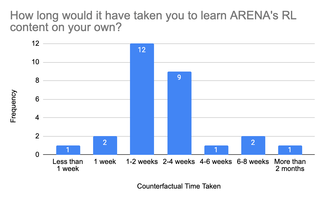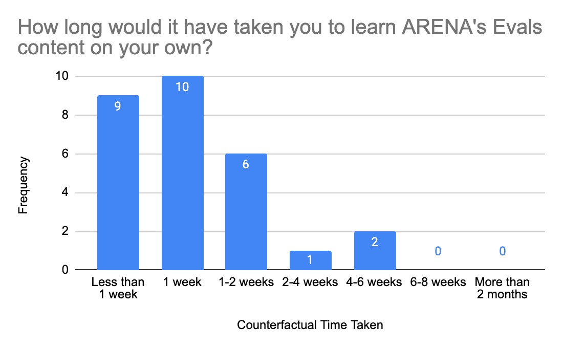 Our in-person taught programme lasts 4 weeks. On average, participants estimated their counterfactual time to learn the full ARENA content unsupervised would have been 9.3 weeks. Two participants felt the programme was too short; another two felt it was too long. The rest felt that the duration was ‘just right’.