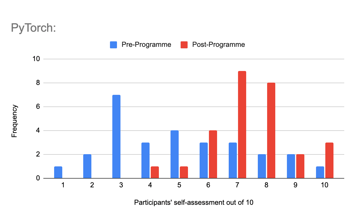 PyTorch Proficiency: Average pre-programme self-assessment of 5.0/10, demonstrating reasonable familiarity with essential ML tooling yet substantial room for improvement.