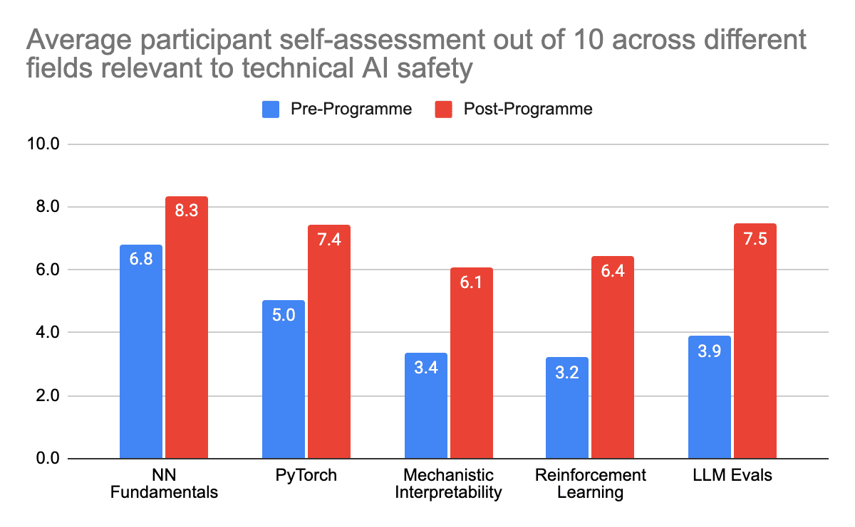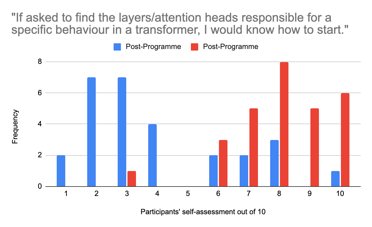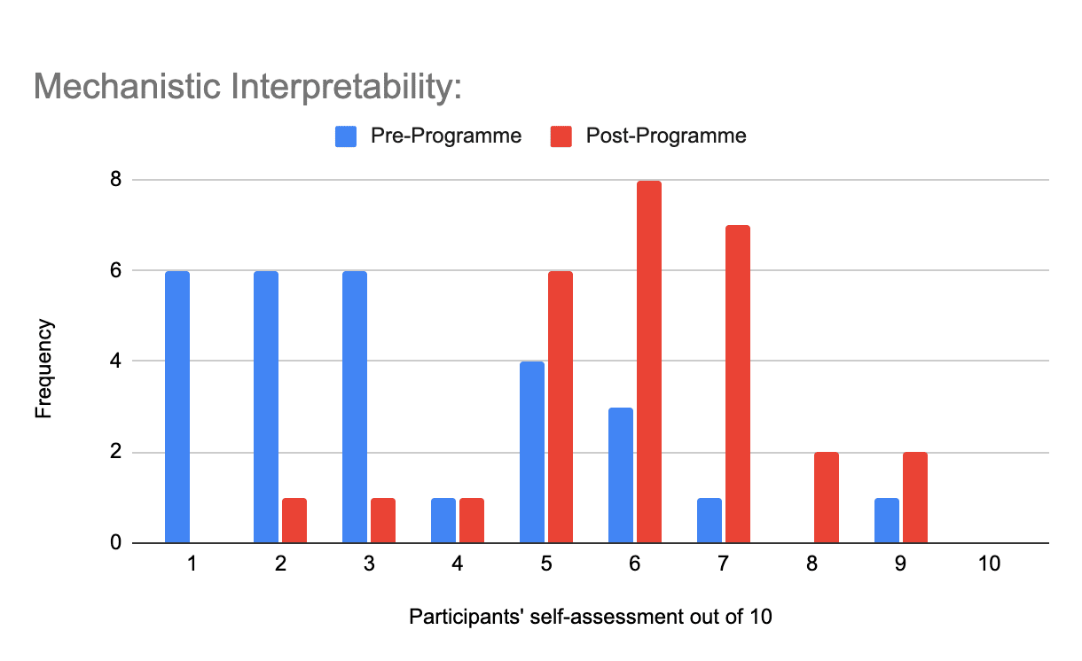 In mechanistic interpretability, participants self-assessed their skills at 3.4/10 pre-programme, indicating appropriate entry-level knowledge for intensive upskilling