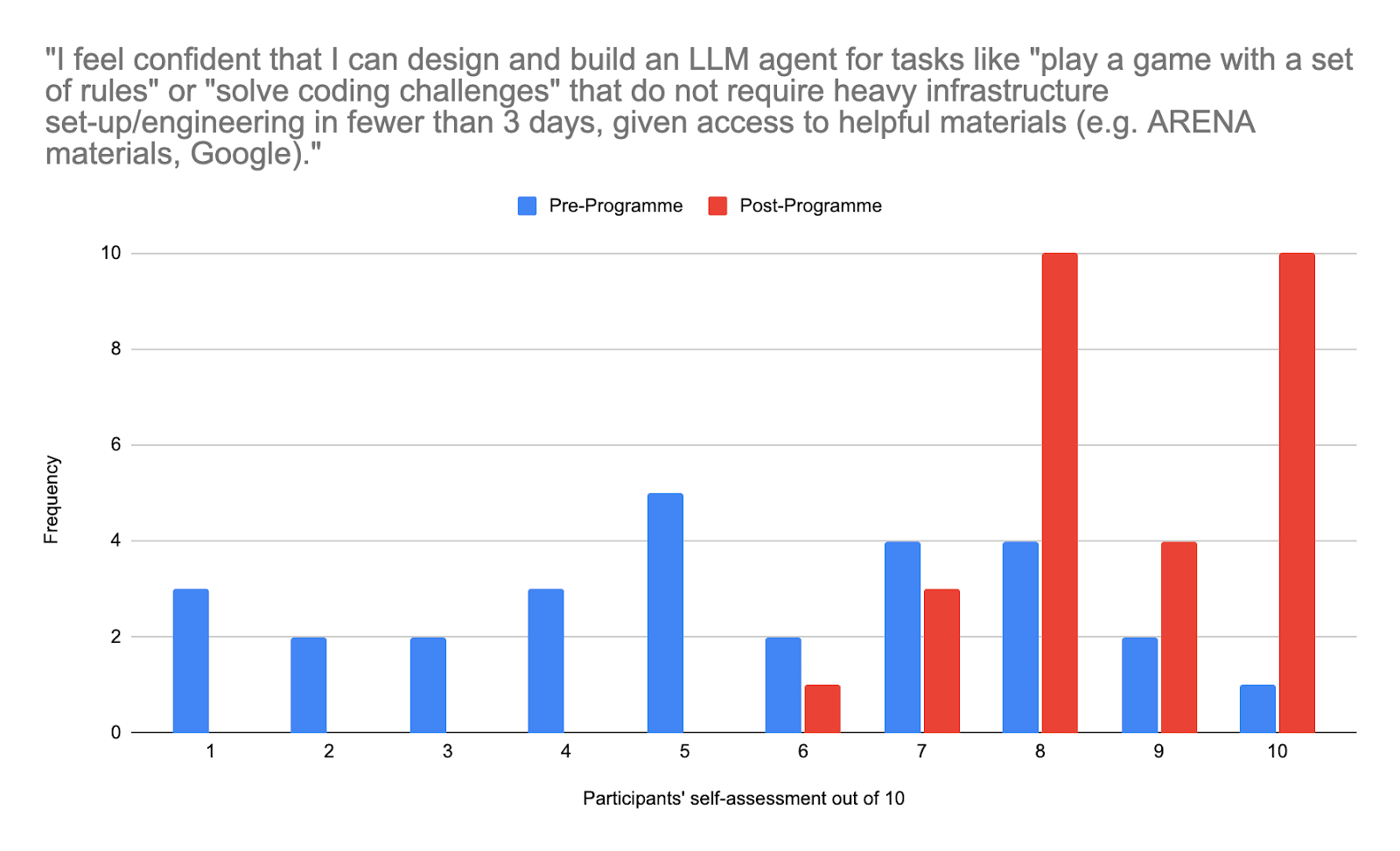 In LLM evaluations, participants self-assessed their skills 3.9/10 pre-programme on average, demonstrating slightly more familiarity with evaluations, but still substantial room for upskilling.