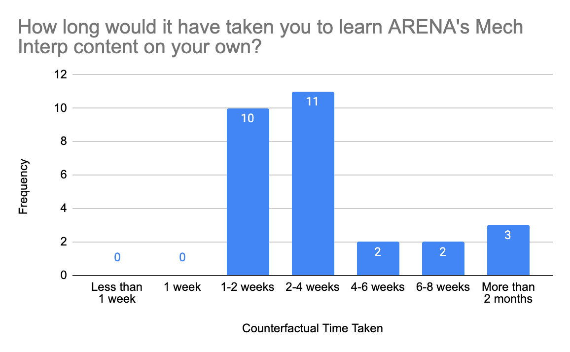 If left to their own devices, participants estimated that self-studying the Transformers and Mech Interp content to the same degree of proficiency would have taken them 3.1 weeks on average, compared to the 1 week spent on the content with us. This continues to underline that this week is arguably the most demanding section of our curriculum.