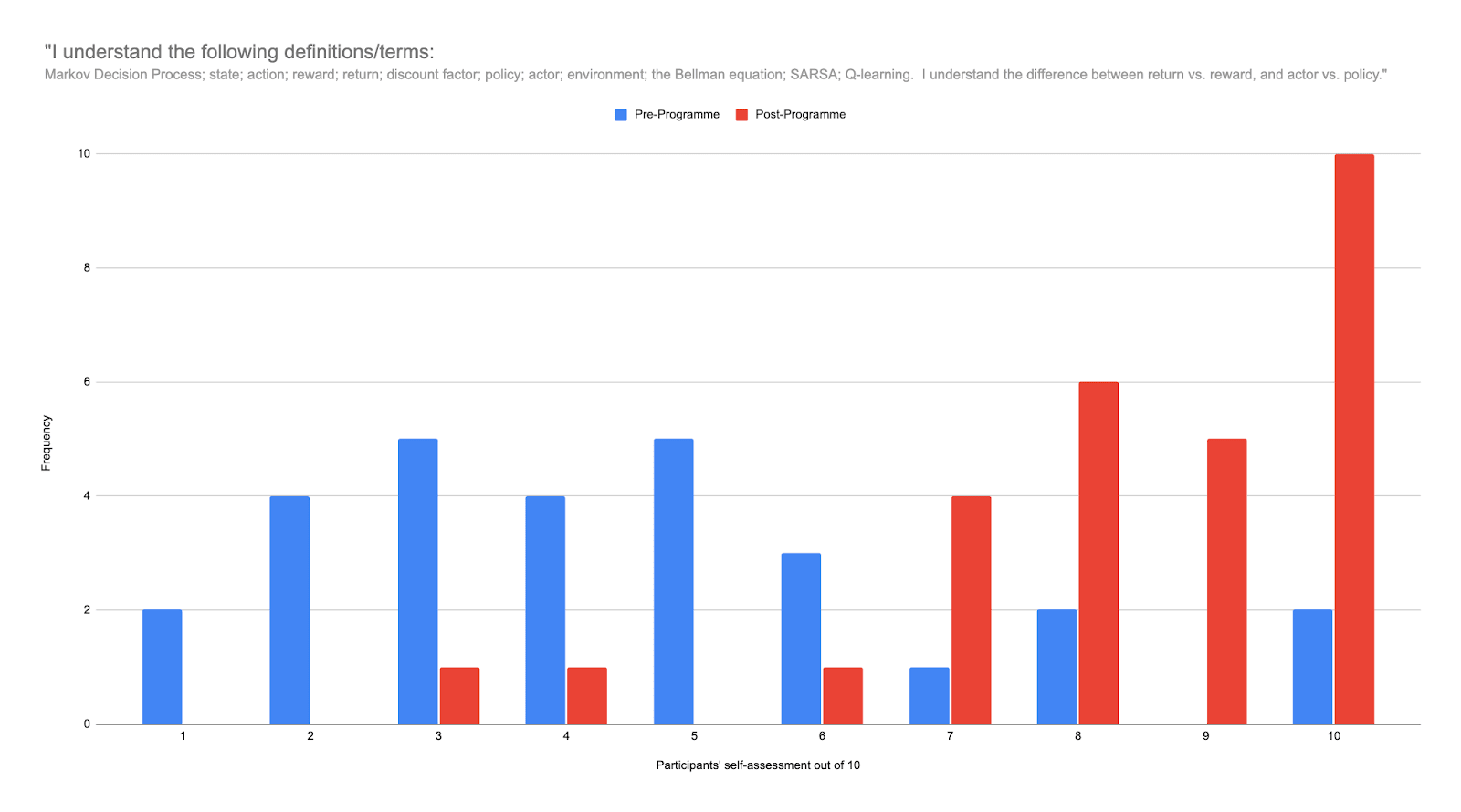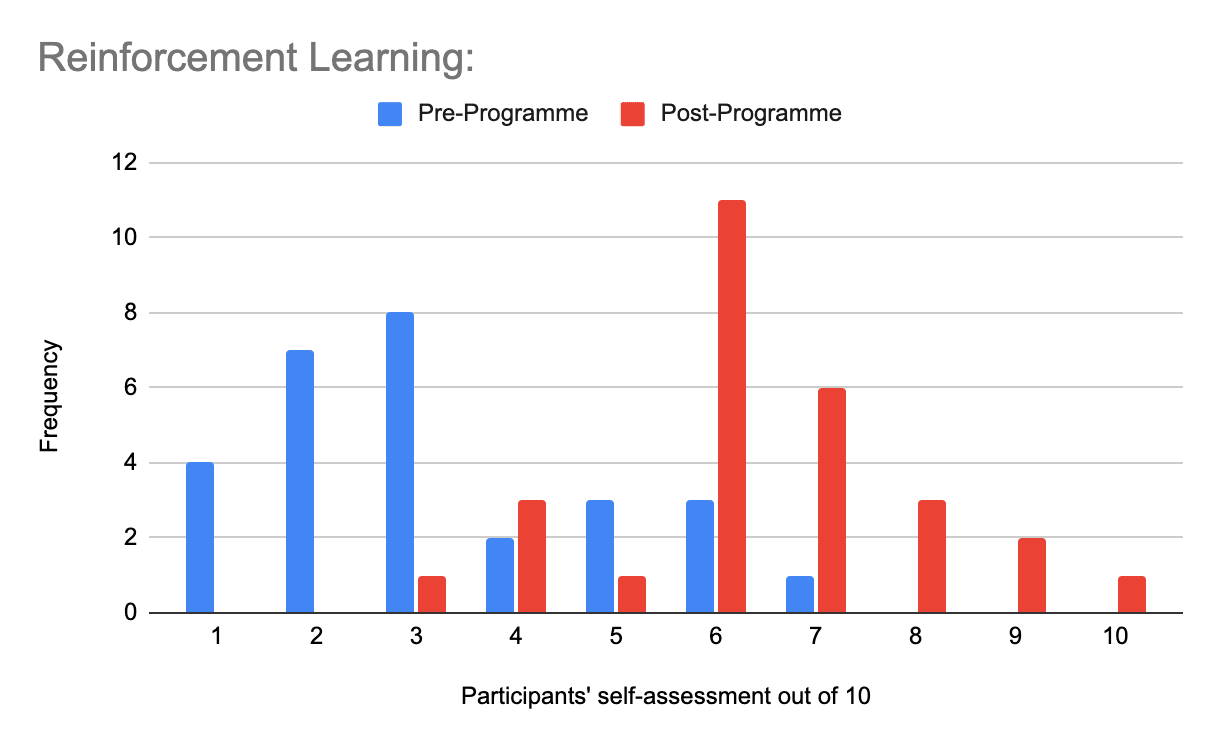 In reinforcement learning, participants self-assessed their skills on average at 3.2/10 pre-programme, positioning participants well for comprehensive RL upskilling