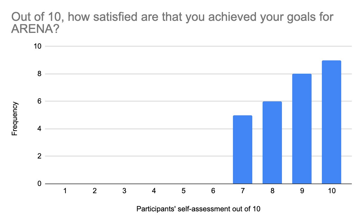 Overall, this iteration of ARENA was highly successful according to our success criteria. We are delighted that our 28 in-person programme participants rated their overall enjoyment of the ARENA programme at 9.3/10, representing our highest satisfaction score to date.