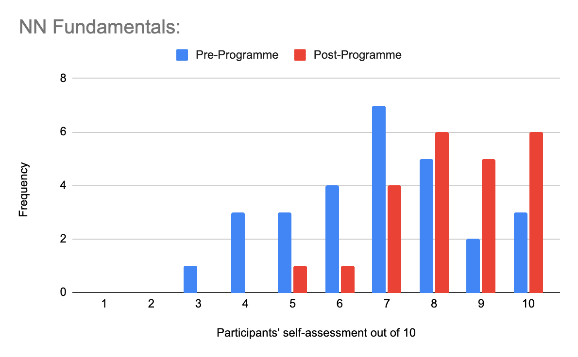 Neural Network Fundamentals: Average pre-programme self-assessment of 6.8/10, indicating participants already possessed substantial knowledge of core ML concepts.