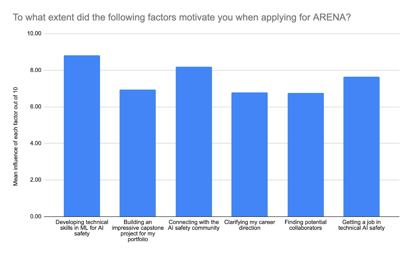 Finally, ARENA aims to accelerate participants’ AI safety careers. We’re really excited about this cohort’s next steps deploying the skills that they acquired during ARENA. At the conclusion of the programme, we observed encouraging patterns in our participants’ career plans; thirteen participants stated they were actively applying for AI alignment roles at the time of the survey, with a further six saying that they were planning to do so after the programme ended. Most excitingly, eight participants had a confirmed full-time position in AI safety beginning in the four months post-ARENA. We are delighted about these outcomes, and they make us optimistic about ARENA’s impact into the future. It is immensely rewarding to witness the programme’s impact in securing one of ARENA’s core goals: to provide talented individuals with the skills to go directly into technical AI safety work.
