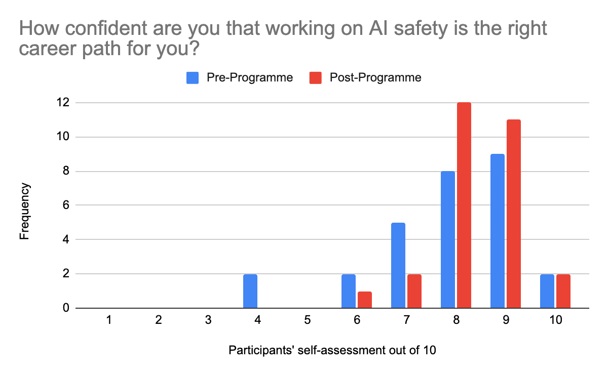 We also saw a difference in participants’ confidence in AI safety being the right field for them. Prior to the programme, when asked to score out of 10 “How confident are you that AI safety is the right field for you?”, participants gave an average of 7.9/10. By the end of the programme, the same question was met with an average response of 8.4/10. The same two participants rated their confidence in this regard at 10/10 before and after the programme.